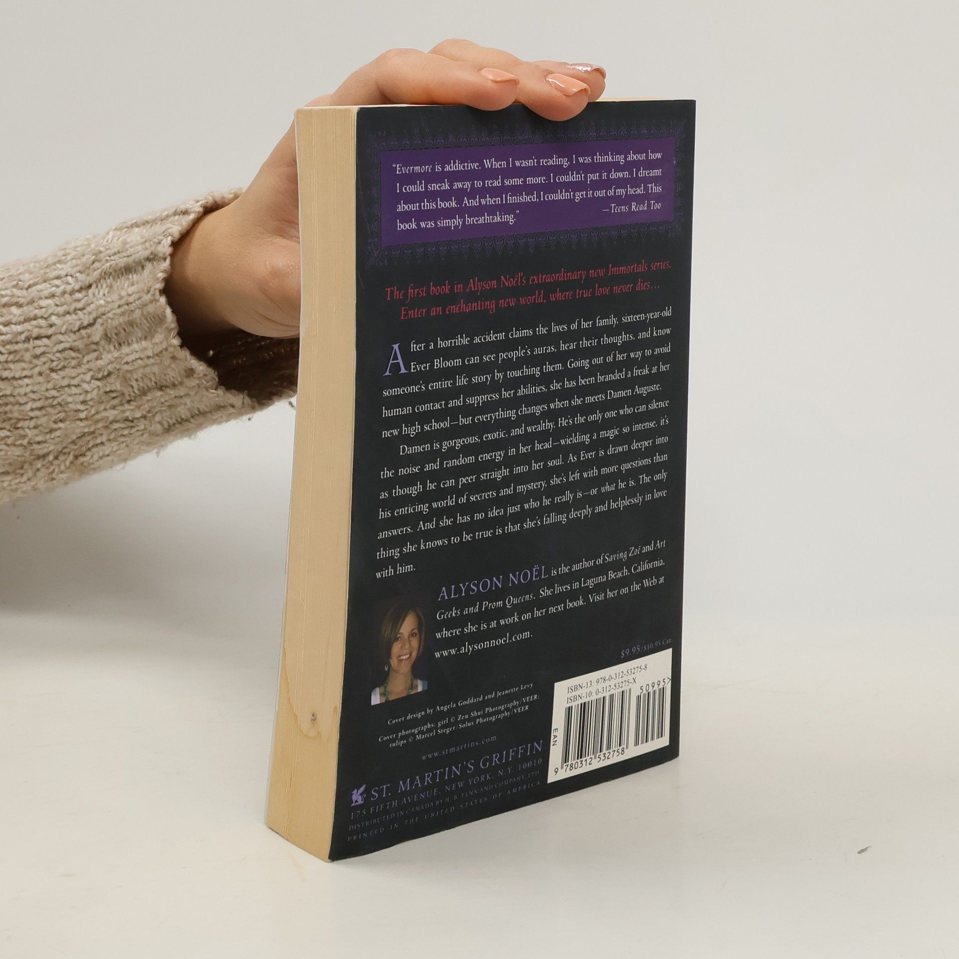 The first book in Alyson Noël's extraordinary new Immortals series. Enter an enchanting new world, where true love never dies...After a horrible accident claims the lives of her family, sixteen-year-old Ever Bloom can see people's auras, hear their thoughts, and know someone's entire life story by touching them. Going out of her way to avoid human contact to suppress her abilities, she has been branded a freak at her new high school—but everything changes when she meets Damen Auguste.Damen is gorgeous, exotic and wealthy. He's the only one who can silence the noise and random energy in her head—wielding a magic so intense, it's as though he can peer straight into her soul. As Ever is drawn deeper into his enticing world of secrets and mystery, she's left with more questions than answers. And she has no idea just who he really is—or what he is. The only thing she knows to be true is that she's falling deeply and helplessly in love with him.