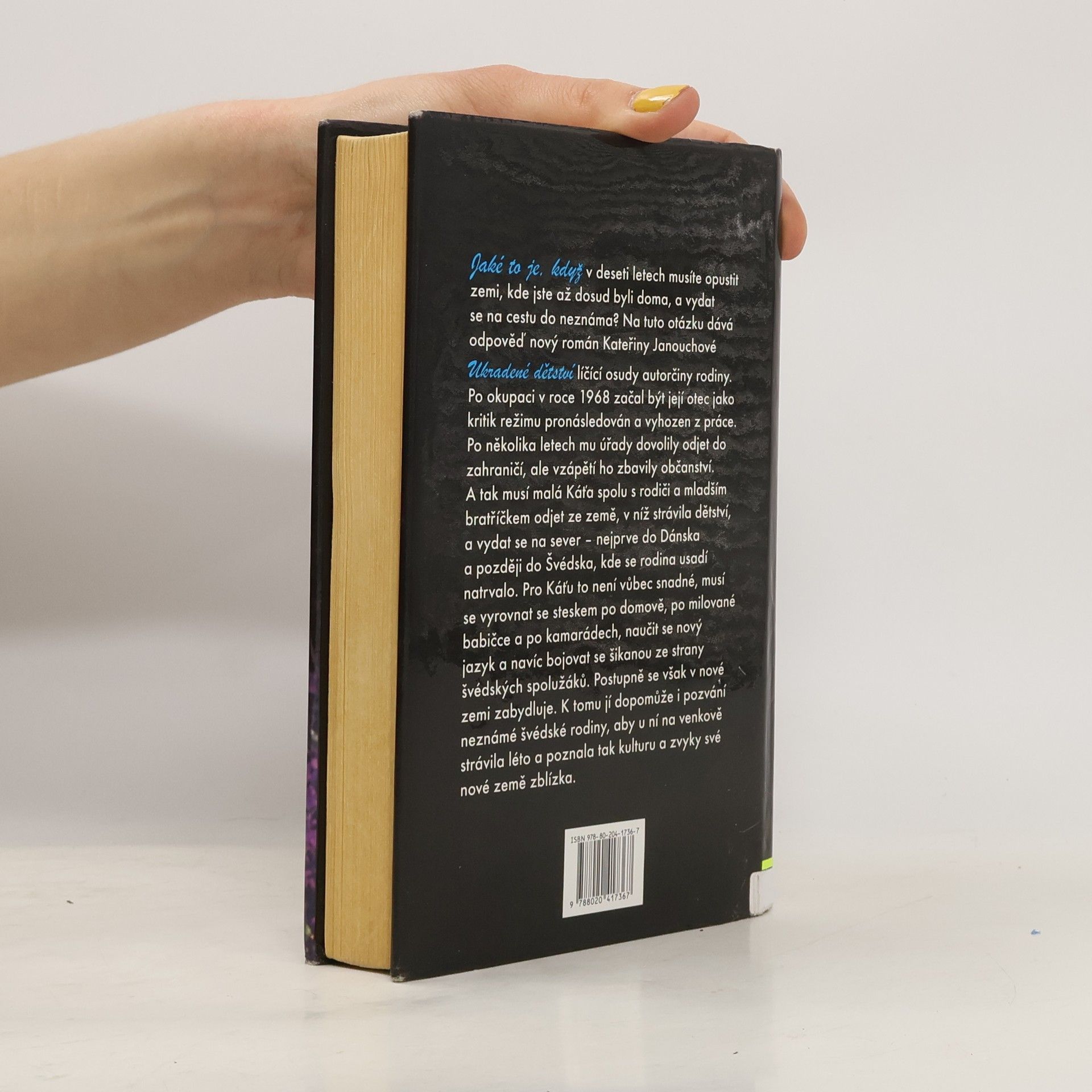Ukradené dětství líčí osudy autorčiny rodiny. Po okupaci v roce 1968 začal být její otec jako kritik režimu pronásledován a vyhozen z práce. Po několika letech mu úřady dovolily odjet do zahraničí, ale vzápětí ho zbavily občanství. A tak musí malá Káťa spolu s rodiči a mladším bratříčkem odjet ze země, v níž strávila dětství, a vydat se na sever - nejprve do Dánska a později do Švédska, kde se rodina usadí natrvalo. Pro Káťu to není vůbec snadné, musí se vyrovnat se steskem po domově, po milované babičce a po kamarádech, naučit se nový jazyk a navíc bojovat se šikanou ze strany švédských spolužáků. Postupně se však v nové zemi zabydluje. K tomu ji dopomůže i pozvání neznámé švédské rodiny, aby u ní na venkově strávila léto a poznala tak kulturu a zvyky své nové země zblízka.