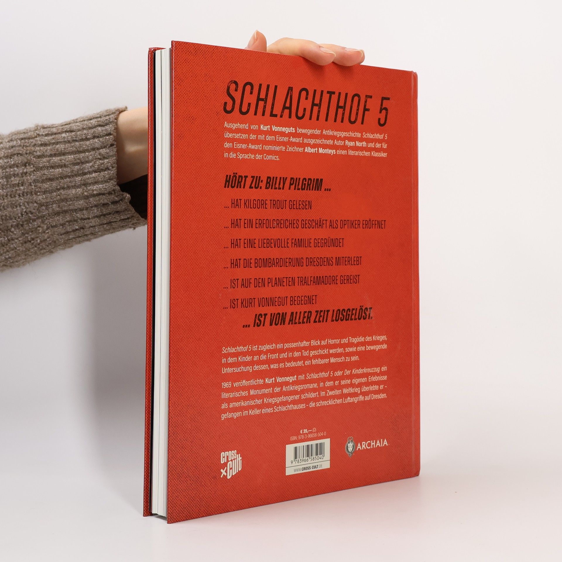 Weltliteratur im Gewand einer Graphic Novel 1969 veröffentlichte Kurt Vonnegut mit SCHLACHTHOF 5 ODER DER KINDERKREUZZUG ein literarisches Monument der Antikriegsromane, in dem er seine eigenen Erlebnisse als amerikanischer Kriegsgefangener schildert. Im Zweiten Weltkrieg überlebte er – gefangen in dem Keller eines Schlachthauses – die schrecklichen Luftangriffe auf Dresden. SCHLACHTHOF 5 ist zugleich ein possenhafter Blick auf Horror und Tragödie des Krieges, in dem Kinder an die Front und in den Tod geschickt werden, sowie eine bewegende Untersuchung dessen, was es bedeutet, ein fehlbarer Mensch zu sein: Billy Pilgrim hat Kilgore Trout gelesen und hat ein erfolgreiches Geschäft rundum die Augenoptik eröffnet. Billy Pilgrim hat eine liebevolle Familie gegründet und die Bombardierung Dresdens miterlebt. Billy Pilgrim ist auf den Planeten Tralfamadore gereist und hat Kurt Vonnegut getroffen. Billy Pilgrim ist von aller Zeit losgelöst. Ausgehend von Kurt Vonneguts bewegender Antikriegsgeschichte SCHLACHTHOF 5 übersetzen der mit dem Eisner Award ausgezeichnete Autor Ryan North (THE UNBEATABLE SQUIRREL GIRL) und der für den Eisner Award nominierte Zeichner Albert Monteys (UNIVERSE!) einen literarischen Klassiker in die Sprache der Comics.