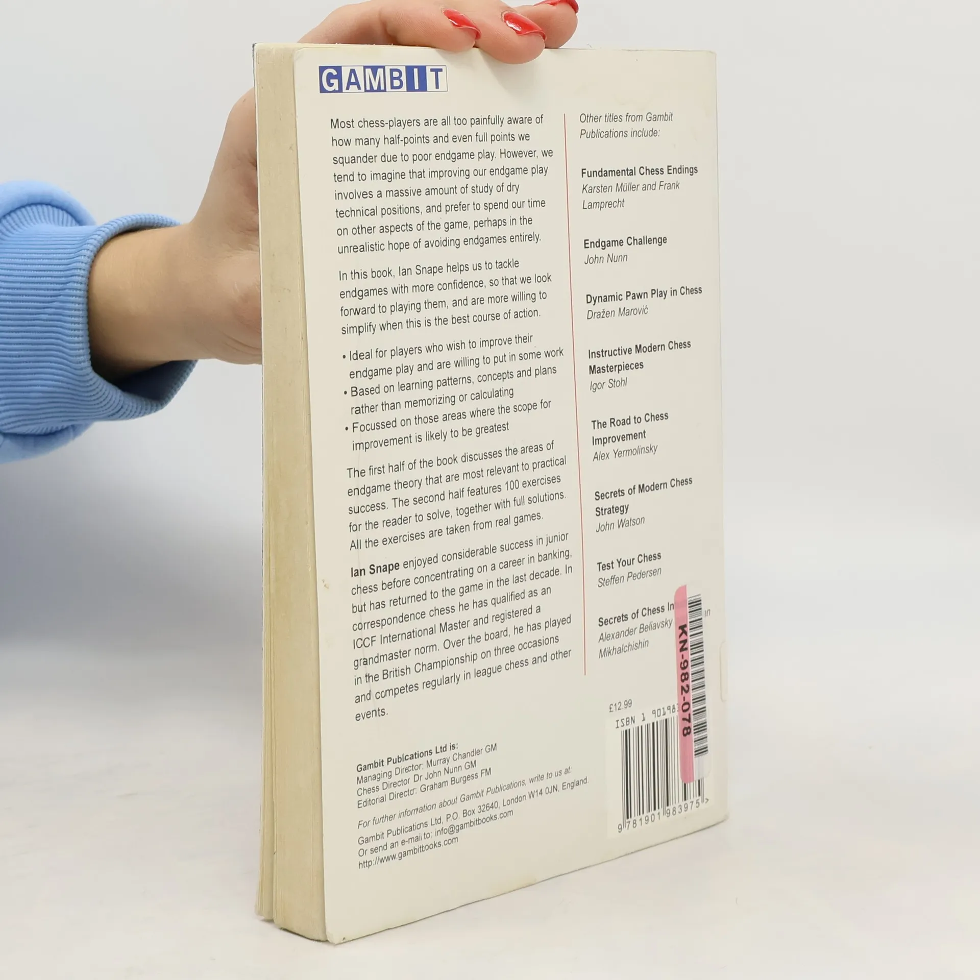 Most chess-players are all too painfully aware of how many half-points and even full points they squander due to poor endgame play. However, they tend to imagine that improving their endgame play involves a massive amount of study of dry technical positions, and prefer to spend their time on other aspects of the game, perhaps in the unrealistic hope of avoiding endgames entirely. In this book, Ian Snape helps them to tackle endgames with more confidence, so that they look forward to playing them, and are more willing to simplify when this is the best course of action. The first half of the book discusses the areas of endgame theory that are most relevant to practical success. The second half features 100 exercises for the reader to solve, together with full solutions. All the exercises are taken from real games.