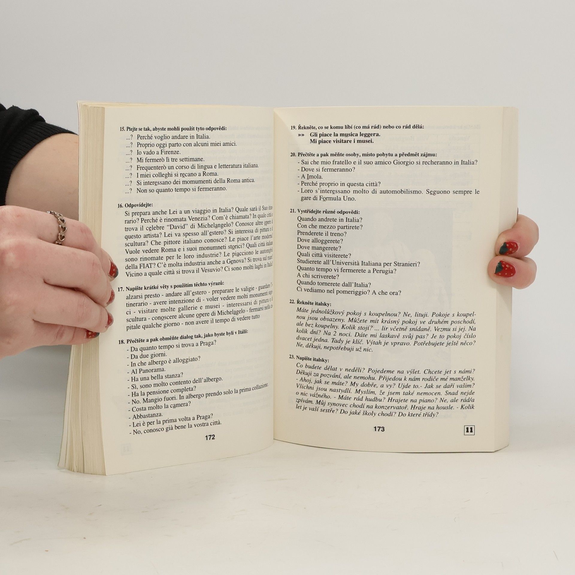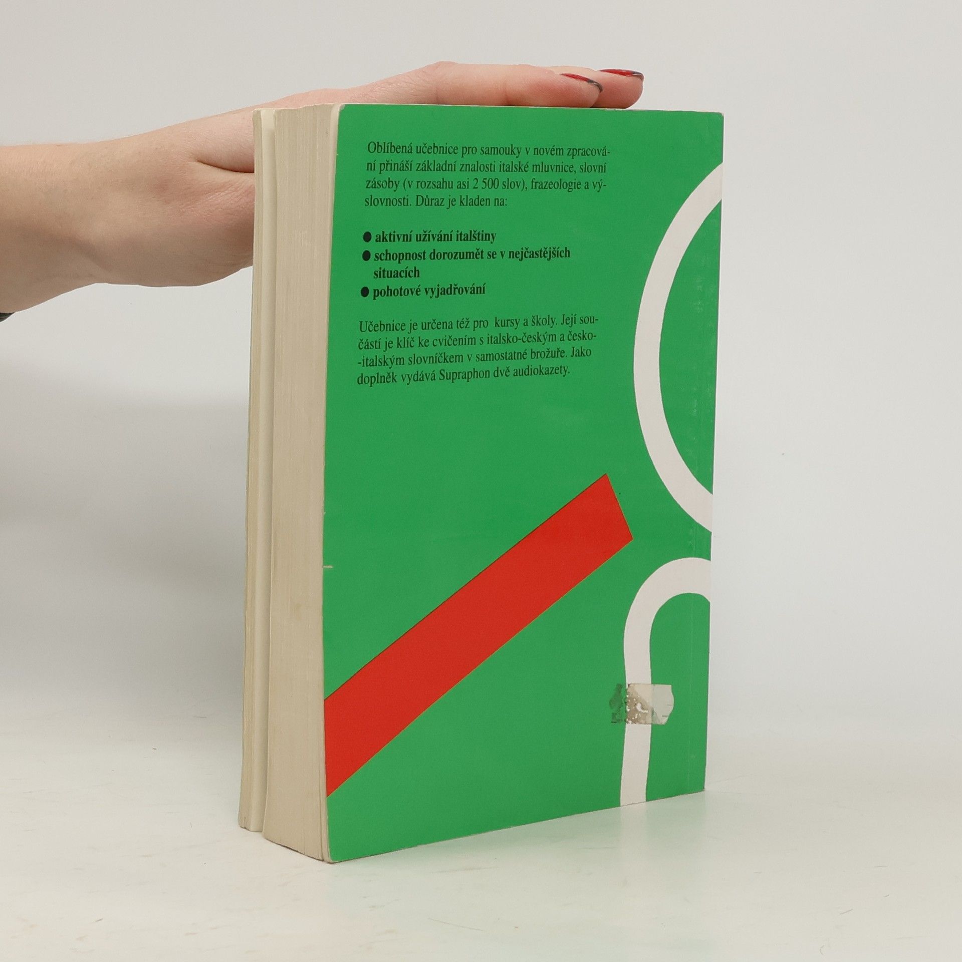Oblíbená učebnice pro samouky v novém zpracování přináší základní znalosti italské mluvnice, slovní zásoby (v rozsahu asi 2500 slov ), frazeologie a výslovnosti. Důraz je kladen na: aktivní užívání italštiny schopnost dorozumět se v nejčastějších situacích pohotové vyjádřování Učebnice je určena též pro školy a kursy. Její součásti je brožura obsahující klíč ke cvičením s italsko-českým a česko-italským slovníčkem. Jako samostatný doplněk vydává Supraphon audionahrávku.... celý text