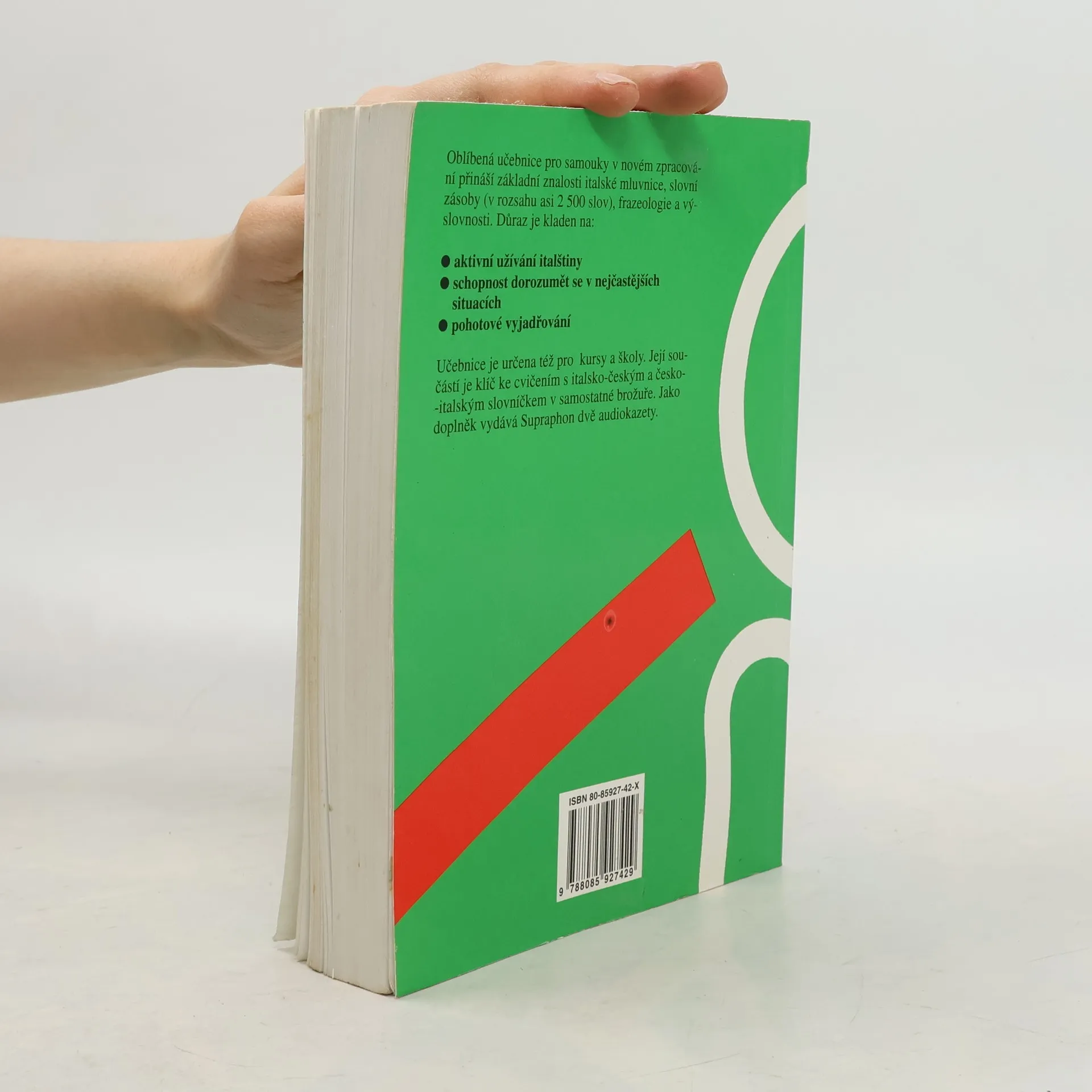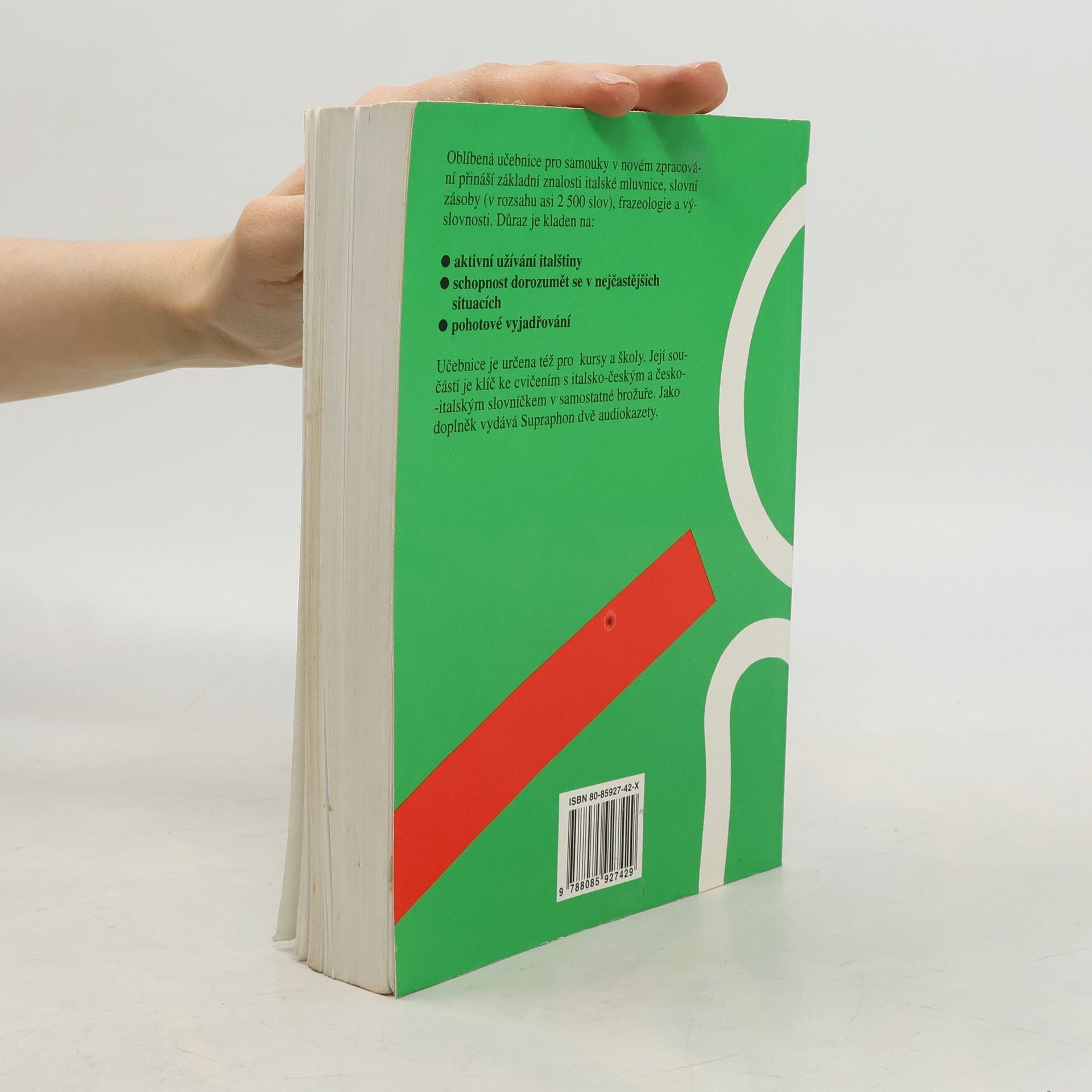 Oblíbená učebnice pro samouky v novém zpracování přináší základní znalosti italské mluvnice, slovní zásoby (v rozsahu asi 2500 slov ), frazeologie a výslovnosti. Důraz je kladen na: aktivní užívání italštiny schopnost dorozumět se v nejčastějších situacích pohotové vyjádřováníUčebnice je určena též pro školy a kursy. Její součásti je brožura obsahující klíč ke cvičením s italsko-českým a česko-italským slovníčkem. Jako samostatný doplněk vydává Supraphon audionahrávku.
