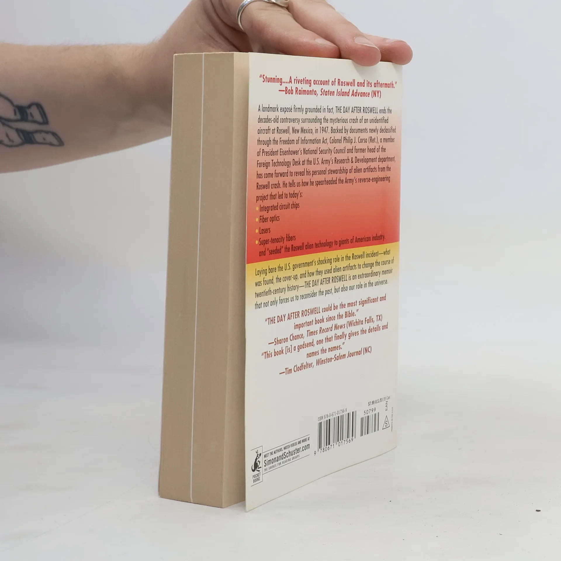 A landmark expose firmly grounded in fact, The Day After Roswell ends the decades-old controversy surrounding the mysterious crash of an unidentified aircraft at Roswell, New Mexico, in 1947. Backed by documents newly declassified through the Freedom of Information Act, Colonel Philip J. Corso (Ret.), a member of President Eisenhower's National Security Council and former head of the Foreign Technology Desk at the U.S. Army's Research & Development department, has come forward to reveal his personal stewardship of alien artifacts from the Roswell crash. He tells us how he spearheaded the Army's reverse-engineering project that led to today's: Integrated circuit chips Fiber optics Lasers Super-tenacity fibers and "seeded" the Roswell alien technology to giants of American industry. Laying bare the U.S. government's shocking role in the Roswell incident -- what was found, the cover-up, and how they used alien artifacts to change the course of twentieth-century history -- The Day After Roswell is an extraordinary memoir that not only forces us to reconsider the past, but also our role in the universe.
