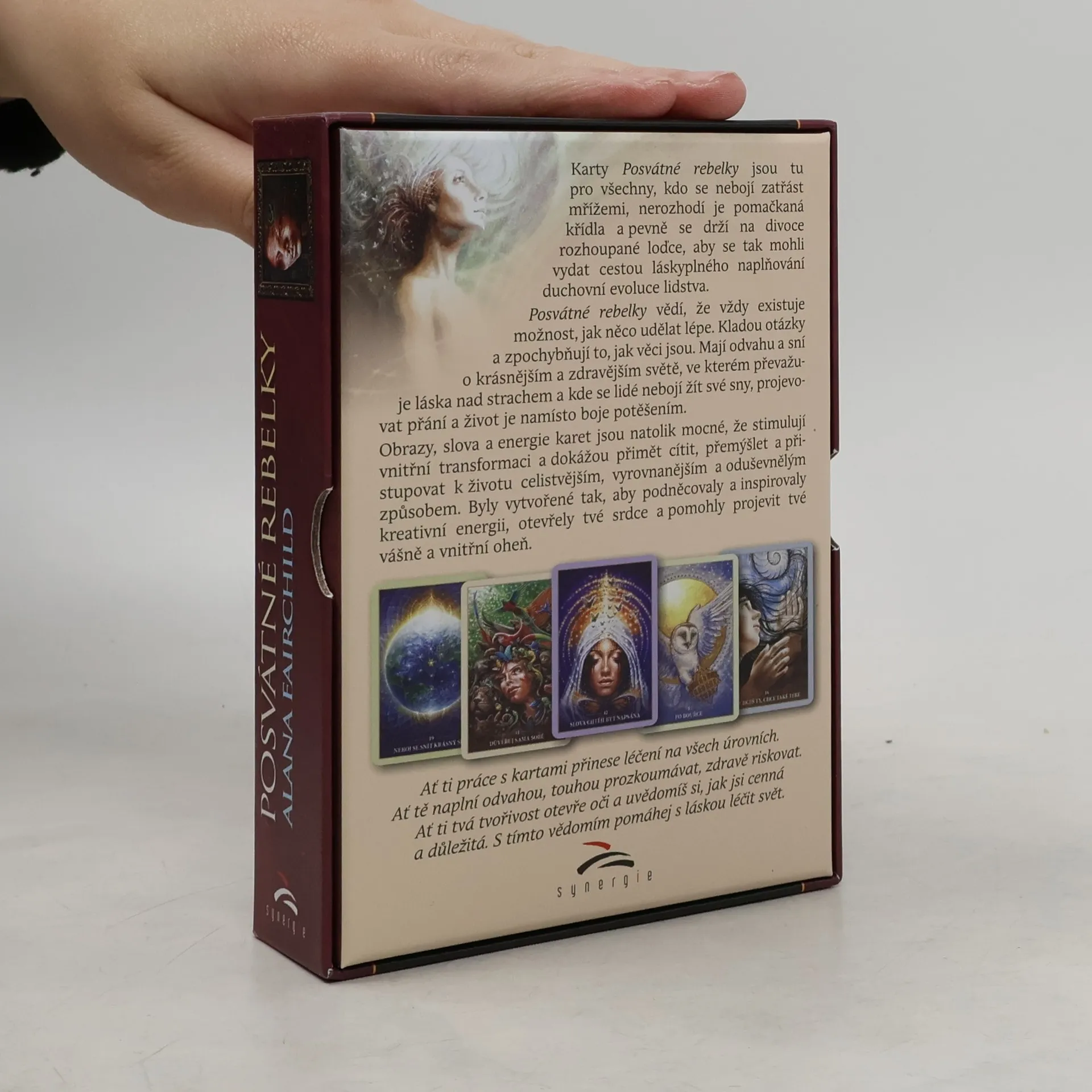 Karty Posvátné rebelky jsou tu pro všechny, kdo se nebojí zatřást mřížemi, nerozhodí je pomačkaná křídla a pevně se drží na divoce rozhoupané loďce, aby se tak mohli vydat cestou láskyplného naplňování duchovní evoluce lidstva. Posvátné rebelky vědí, že vždy existuje možnost, jak něco udělat lépe. Kladou otázky a zpochybňují to, jak věci jsou. Mají odvahu a sní o krásnějším a zdravějším světě, ve kterém převažuje láska nad strachem a kde se lidé nebojí žít své sny, projevovat přání a život je namísto boje potěšením. Obrazy, slova a energie karet jsou natolik mocné, že stimulují vnitřní transformaci a dokážou přimět cítit, přemýšlet a přistupovat k životu celistvějším, vyrovnanějším a oduševnělým způsobem. Byly vytvořené tak, aby podněcovaly a inspirovaly kreativní energii, otevřely tvé srdce a pomohly projevit tvé vášně a vnitřní oheň.