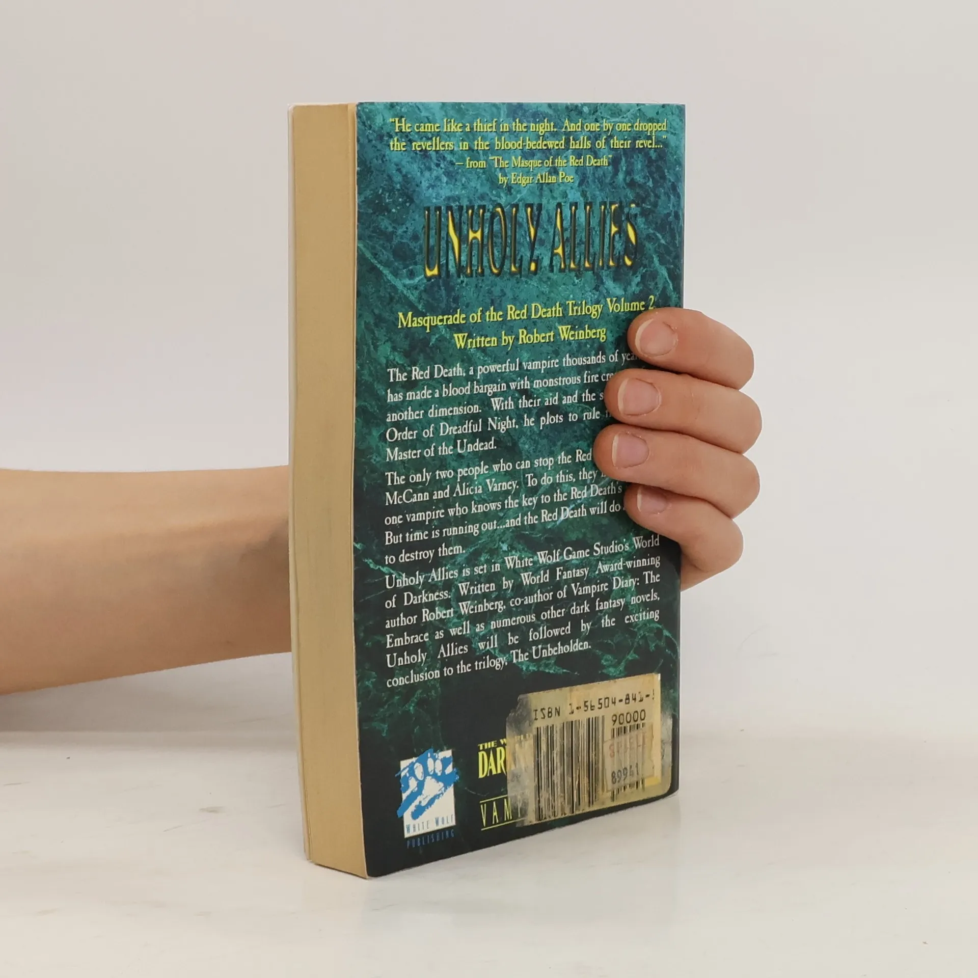 The Red Death, a powerful vampire thousands of years old, has made a blood bargain with the monstrous fire creatures from another dimension. With their aid and the support of the Order of Dreadful Night, he plots to rule the world as Master of the Undead.The only two people who can stop the Red Death are the Dire McCann and Alicia Varney. To do this they must find the one vampire who knows the key to the Red Death's identity. But time is running out ...and the Red Death will do anything to destroy them.Unholy Allies is set in White Wolf Game Studio's World of Darkness. Wirtten by World Fantasy Award-winning author Robert Weinberg, co-author of Vampire Diary: The Embrace as well as numerous other dark fantasy novels, Unholy Allies will be followed by the exciting conclusion to the trilogy, The UnbeholdenCustomers who bought this item also purchased Masquerade of the Red Death Trilogy Volume 3: The Unbeholden Masquerade of the Red Death Trilogy Volume 1: Bloodwar The Horizon War Volume 1: The Road to Hell The Horizon War Volume 3: War in Heaven The Horizon War Volume 2: The Ascension Warrior Trilogy of the Fallen Book 3: The Wreckage of Paradise Previous Next