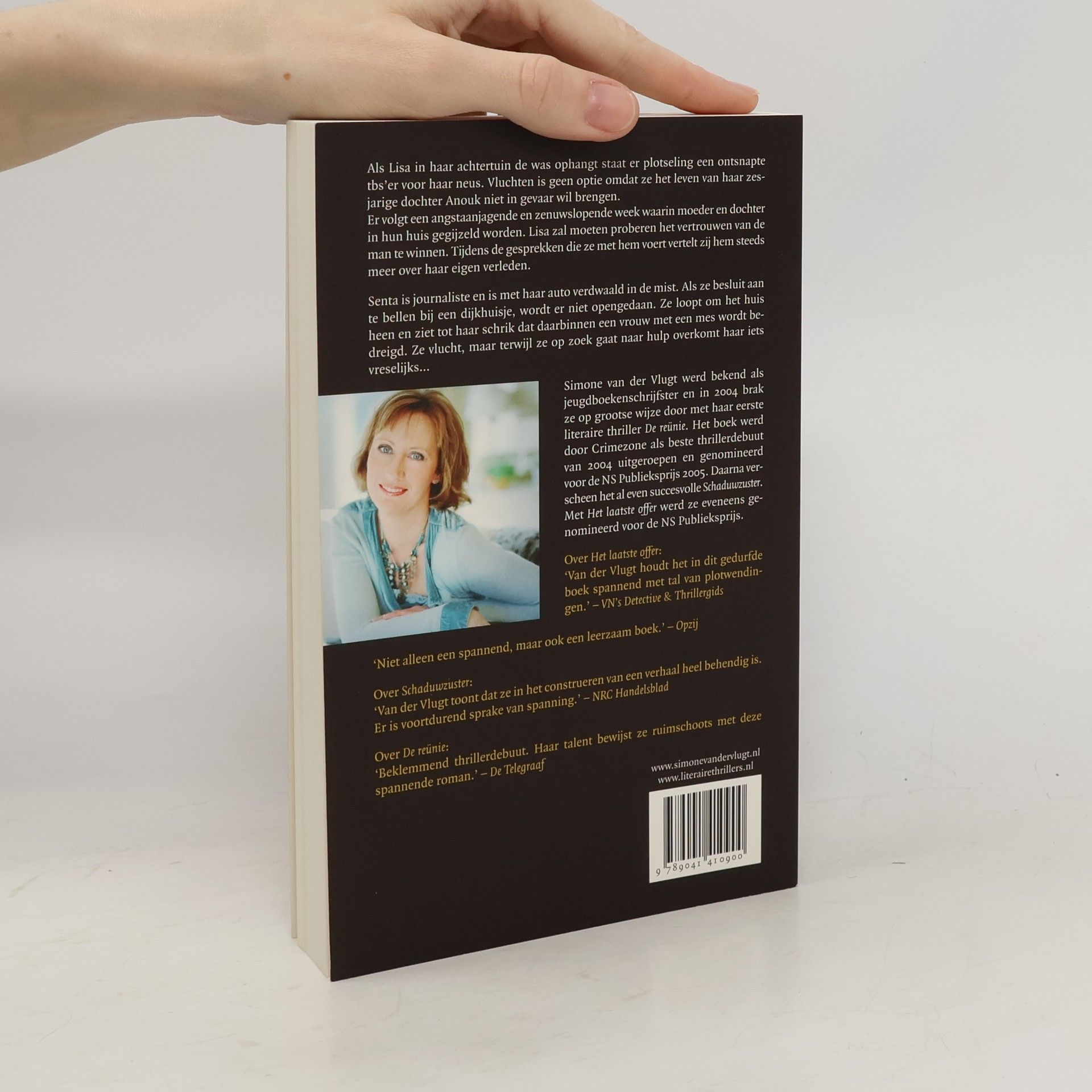 Als Lisa in haar achtertuin de was ophangt staat er ineens een ontsnapte tbs'er voor haar neus. Vluchten is geen optie omdat ze het leven van haar zesjarige dochter Anouk niet in gevaar wil brengen. Er volgt een angstaanjagende en zenuwslopende week waarin moeder en dochter gegijzeld worden in hun eigen huis. Lisa zint op een ontsnappingspoging maar heeft weinig bewegingsvrijheid. Het enige waar ze op kan rekenen is haar inlevingsvermogen, fantasie en mensenkennis. Maar is dat genoeg om het er levend vanaf te brengen? Senta is journalist en is met haar auto verdwaald in de mist. Als ze besluit aan te bellen bij een dijkhuisje, wordt er niet opengedaan. Ze loopt om het huis heen en ziet tot haar schrik dat daarbinnen een vrouw met een mes wordt bedreigd. Ze vlucht, maar terwijl ze op zoek gaat naar hulp overkomt haar iets vreselijks...