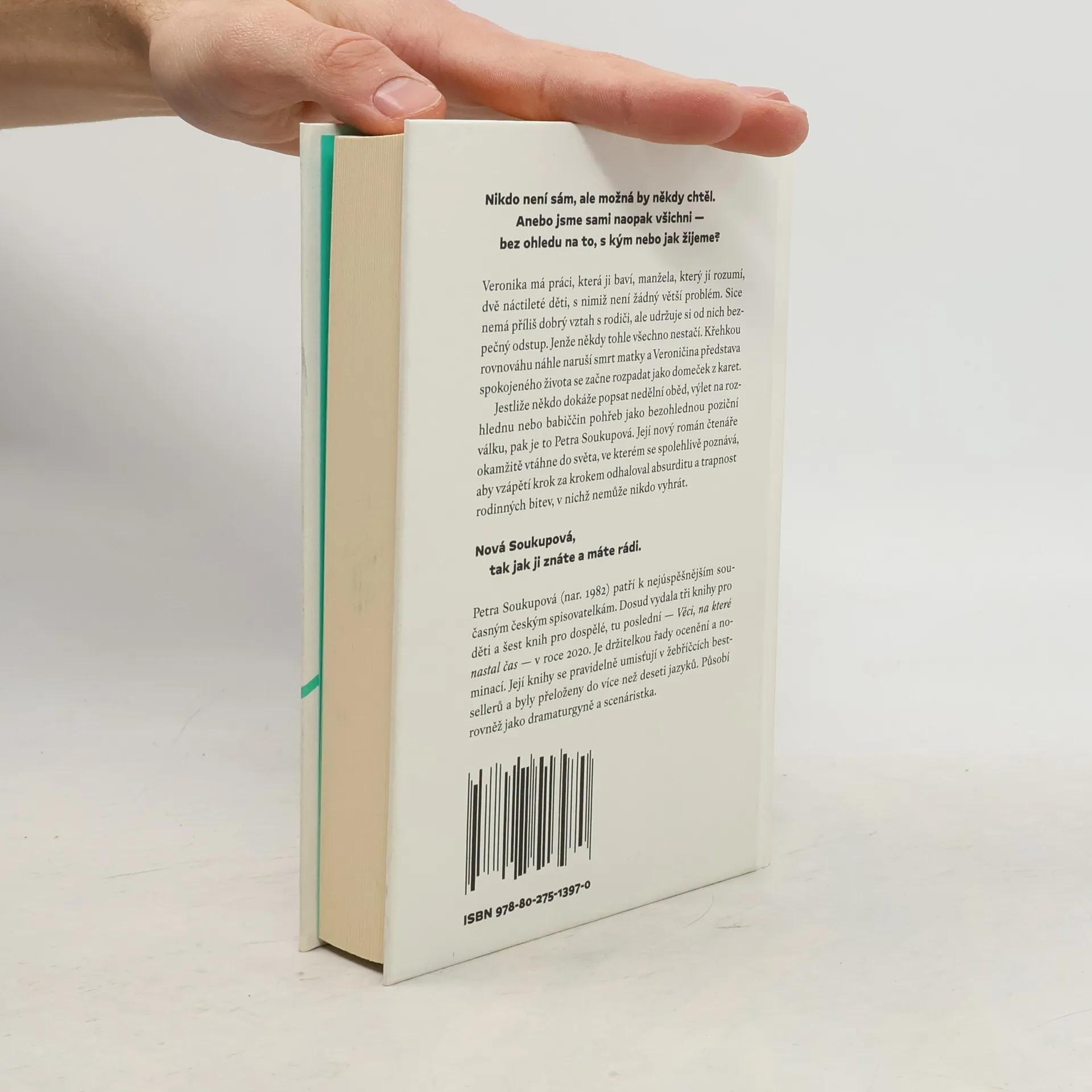 Nikdo není sám, ale možná by někdy chtěl. Anebo jsme sami naopak všichni — bez ohledu na to, s kým nebo jak žijeme?Veronika má práci, která ji baví, manžela, který jí rozumí, dvě náctileté děti, s nimiž není žádný větší problém. Sice nemá příliš dobrý vztah s rodiči, ale udržuje si od nich bezpečný odstup. Jenže někdy tohle všechno nestačí. Křehkou rovnováhu náhle naruší smrt matky a Veroničina představa spokojeného života se začne rozpadat jako domeček z karet.Jestliže někdo dokáže popsat nedělní oběd, výlet na rozhlednu nebo babiččin pohřeb jako bezohlednou poziční válku, pak je to Petra Soukupová. Její nový román čtenáře okamžitě vtáhne do světa, ve kterém se spolehlivě poznává, aby vzápětí krok za krokem odhaloval absurditu a trapnost rodinných bitev, v nichž nemůže nikdo vyhrát.Nová Soukupová, tak jak ji znáte a máte rádi.