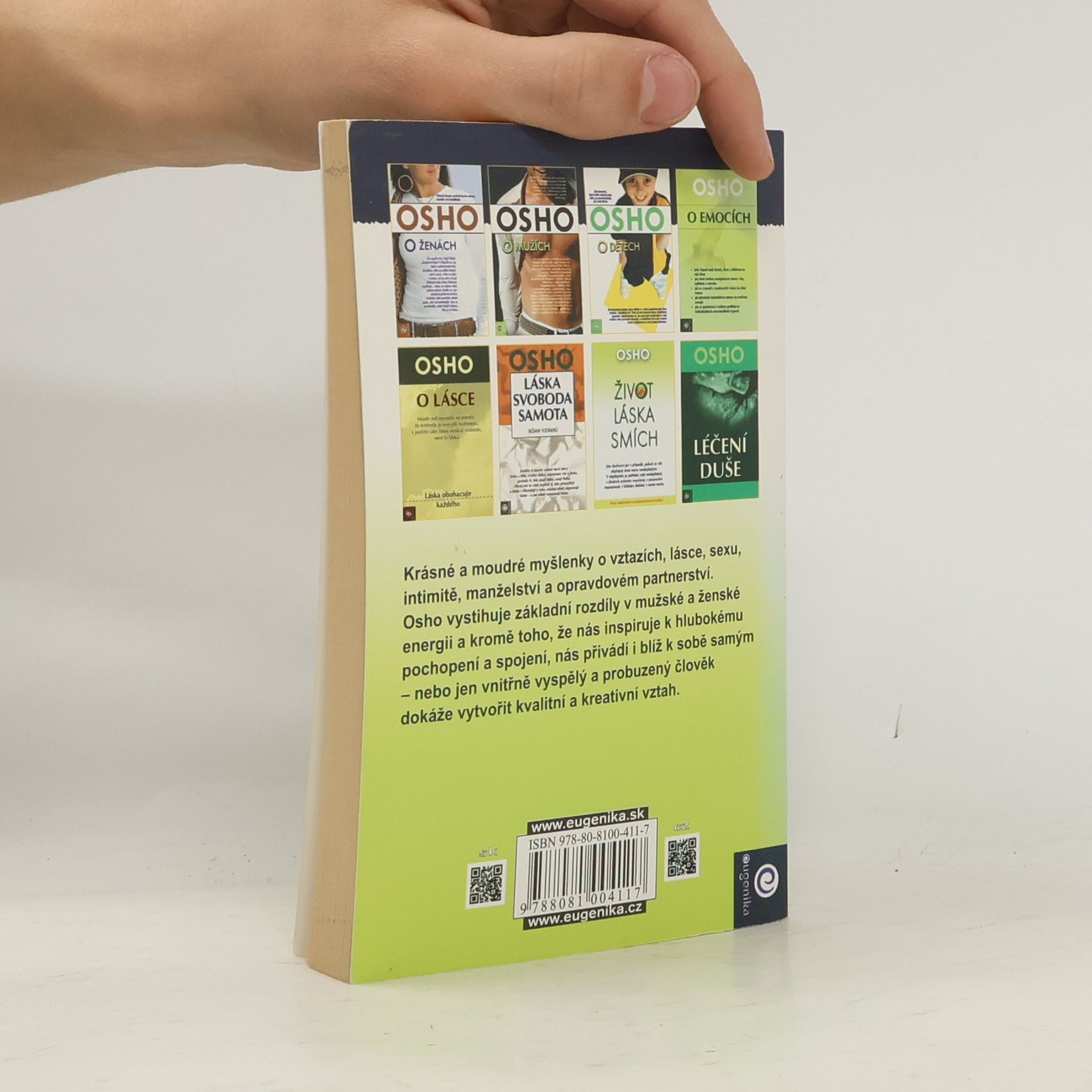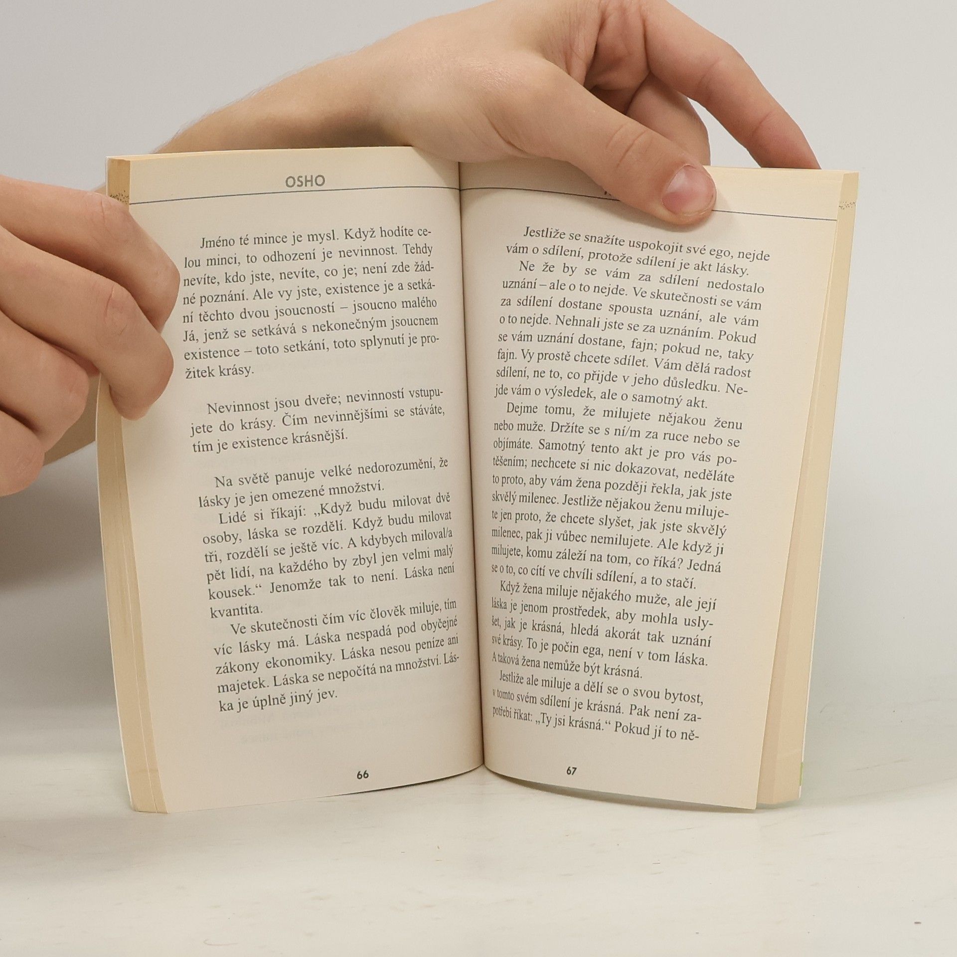 Krásné a moudré myšlenky o vztazích, lásce, sexu, intimitě, manželství a opravdovém partnerství. Osho vystihuje základní rozdíly v mužské a ženské energii a kromě toho, že nás inspiruje k hlubokému pochopení a spojení, nás přivádí i blíž k sobě samým - nebo jen vnitřně vyspělý a probouzený člověk dokáže vytvořit kvalitní a kreativní vztah. Ukázka: Vztah znamená něco ukončeného, završeného, uzavřeného. Láska nikdy není vztah; láska je vztahování se. Je pořád jako řeka, která teče bez konce. Láska nezná zastavení; líbánky mají začátek, ale ne konec. Není to jako román, který v určitém bodě začíná a v určitém končí. Je to stále trvající jev. Milenci končí, láska pokračuje. Je to sloveso, ne podstatné jméno. Ale proč oklešťujeme krásu vztahování se na vztah? Proč tolik pospícháme? Protože vztahovat se není bezpečné; vztah je bezpečí, vztah je jistota. Vztahování se je pouze setkání dvou cizinců; možná jen přes noc a ráno sbohem. Kdo ví, co bude zítra? Ale my se tolik bojíme, že si to chceme pojistit, chceme to udělat předvídatelným. Chceme, aby byl zítřek podle našich představ; nedovolíme mu, aby byl svobodný a dělal si, co chce...