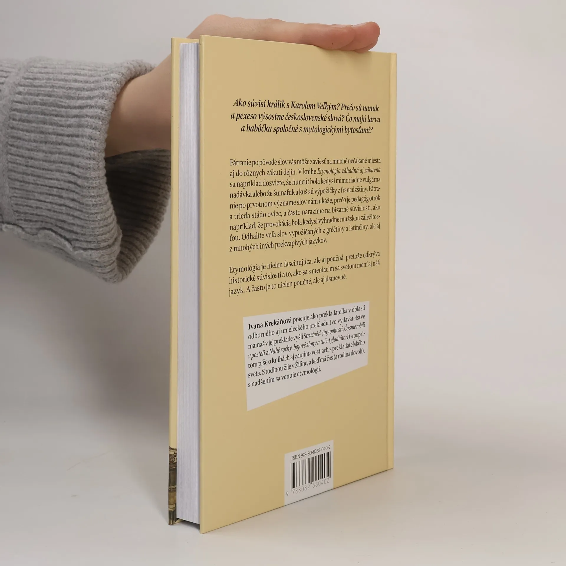 Slová a slovné spojenia časom menia význam spôsobmi, ktoré sú často zaujímavé, niekedy vtipné, či dokonca bizarné. Pátranie po pôvode slov vás môže zaviesť na mnohé nečakané miesta aj do rôznych zákutí dejín. Vedeli ste napríklad, že huncút bola kedysi mimoriadne vulgárna nadávka? Že šuhaj je vlastne Švajčiar a za slovo sabotáž môžu dreváky a istý anarchista?Etymológia je nie len fascinujúca veda, ale aj jedna z najzábavnejších. Kníh o pôvode slov je v našom prostredí málo, a tie, ktoré máme k dispozícii, sa venujú zväčša zaužívaným výrazom či ustáleným slovným spojeniam – frazeologizmom. Ivana Krekáňová napísala knihu o zaujímavostiach zo sveta bežných slov, ktoré denno i denne používame v našom jazyku.V pätnástich tematických kapitolách prináša príbehy vzniku a pôvodu rôznych slov a slovných spojení, ktoré vás zaručene prekvapia. Ivana do každej kapitoly zaradila tie najzaujímavejšie. Napríklad v kapitole Od cynika po tyrana (etymológia učená a politická) sa tak dozviete, ako vznikli rozhodnutia od zeleného stola; alebo v kapitole Od jachty po šmejda (etymológia v hmotných statkoch) zas to, že za autobus môžu francúzske kúpele a čo má s peniazmi chrám rímskej bohyne.