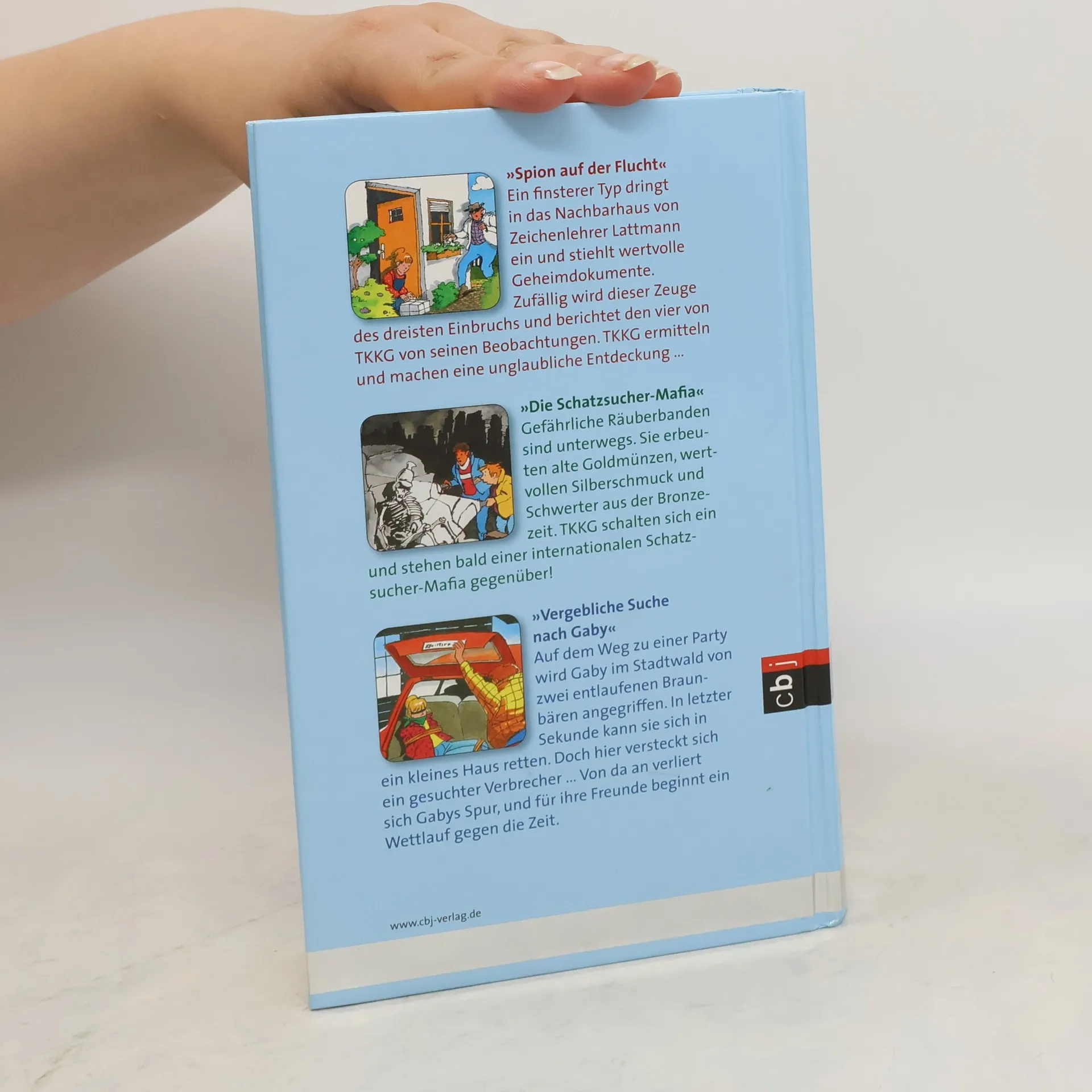 Drei spannende Fälle im Sammelband: In „Spion auf der Flucht“ beobachten TKKG einen Einbruch und machen eine überraschende Entdeckung. „Die Schatzsucher-Mafia schlägt zu“ handelt von gefährlichen Räubern, die wertvolle Schätze stehlen. In „Vergebliche Suche nach Gaby“ wird Gaby von Bären bedroht und findet sich in einem Haus mit einem Verbrecher wieder.