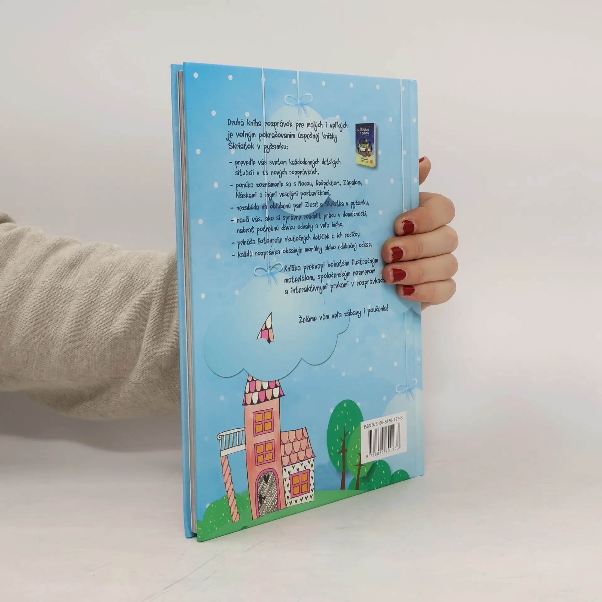 Pani Zlosť sa vracia!Druhá knižka rozprávok pre malých aj veľkých je voľným pokračovaním úspešnej knižky Škriatok v pyžamku. Prevedie vás svetom každodenných detských situácií v 13 nových rozprávkach. Hlavní hrdinovia sa popasujú so zápalom v ušku, s trénovaním výslovnosti hlásky R, s obhrýzaním nechtíkov, s nechuťou podeliť sa o hojdačku s inými deťmi, s nočným vybiehaním z postieľky a s ďalšími detskými trampotami.Knižka je ideálnym návodom pre rodičov na zvládnutie výchovných problémov s vtipom a ľahkosťou. Ponúka zoznámenie sa s Nocou, Rešpektom, bacilmi Helom a Monelou a inými veselými postavičkami. Nezabúda ani na obľúbenú pani Zlosť a Škriatka v pyžamku. Knižka prekvapí bohatším ilustračným materiálom, spoločenským rozmerom a interaktívnymi prvkami v rozprávkach.Knižka je vhodná pre čitateľov od 3 rokov.
