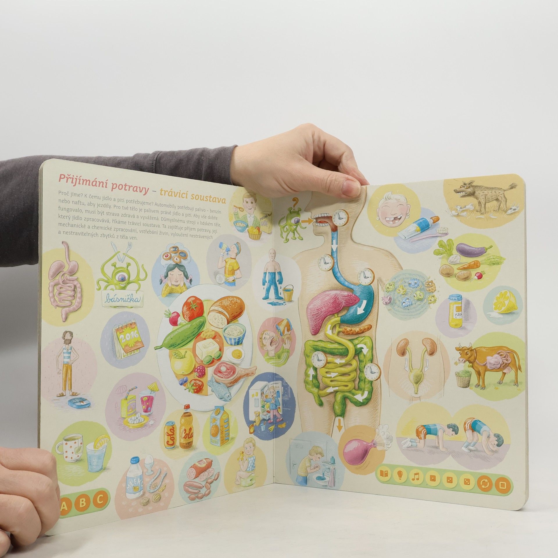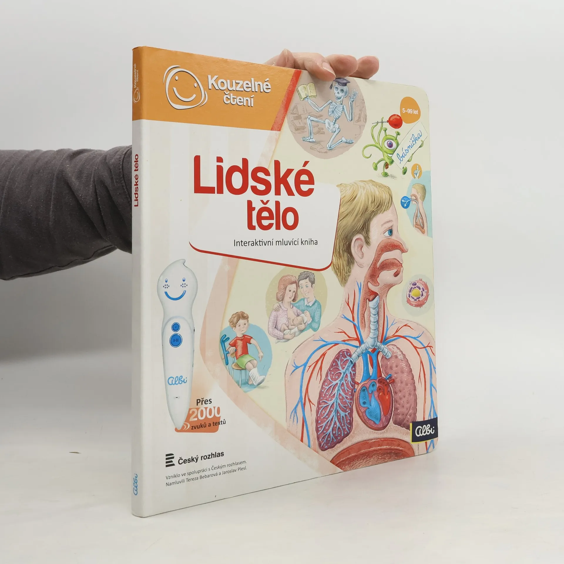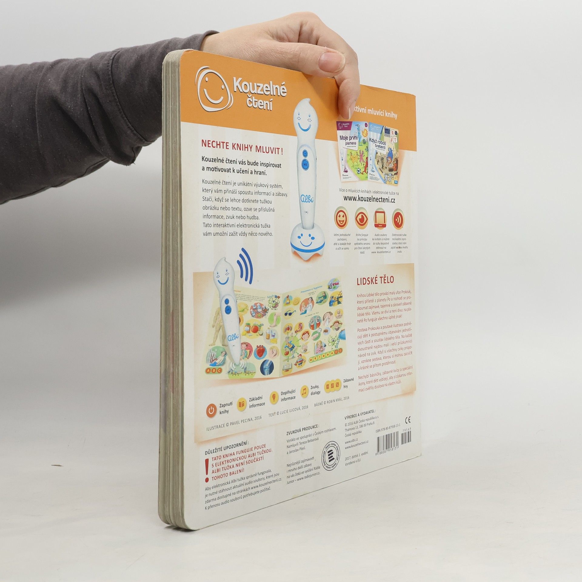 Interaktivní mluvící kniha z edice Kouzelné čtení, se kterou se děti již od 3 let dozvědí spoustu zajímavých a užitečných informací o našem těle. Knihou Lidské tělo provází malý ufon Prokouk, který přiletěl z planety Po, aby prozkoumal taje lidského těla. Všemu se diví a není divu: na planetě Po funguje všechno úplně jinak! Postava Prokouka a poutavé ilustrace podněcují děti k postupnému objevování jednotlivých částí a soustav lidského těla. Kniha je členěna do 8 kapitol a témata jsou např. Kosti a svaly, Mozek a nervy, Rozmnožování, Trávicí soustava, Srdce a plíce atd. Na každé dvoustraně najdou malí i velcí průzkumníci návod na cvik. Když si všechny cviky propojí, vznikne sestava, kterou si mohou zacvičit a krásně se přitom protáhnout. V knize Lidské tělo najdete také básničky, zábavné kvízy a speciální ikony, které děti vybízí, aby si získanou informaci zkusili doslava na vlastní kůži. Kniha obsahuje téměř 2000 zvuků a textů. Knihu ilustroval Pavel Pecina, básničky napsal Robin Král, texty Lucie Ujcová. Vzniklo ve spolupráci s Českým rozhlasem, knihu namluvili Tereza Bebarová a Jaroslav Plesl.