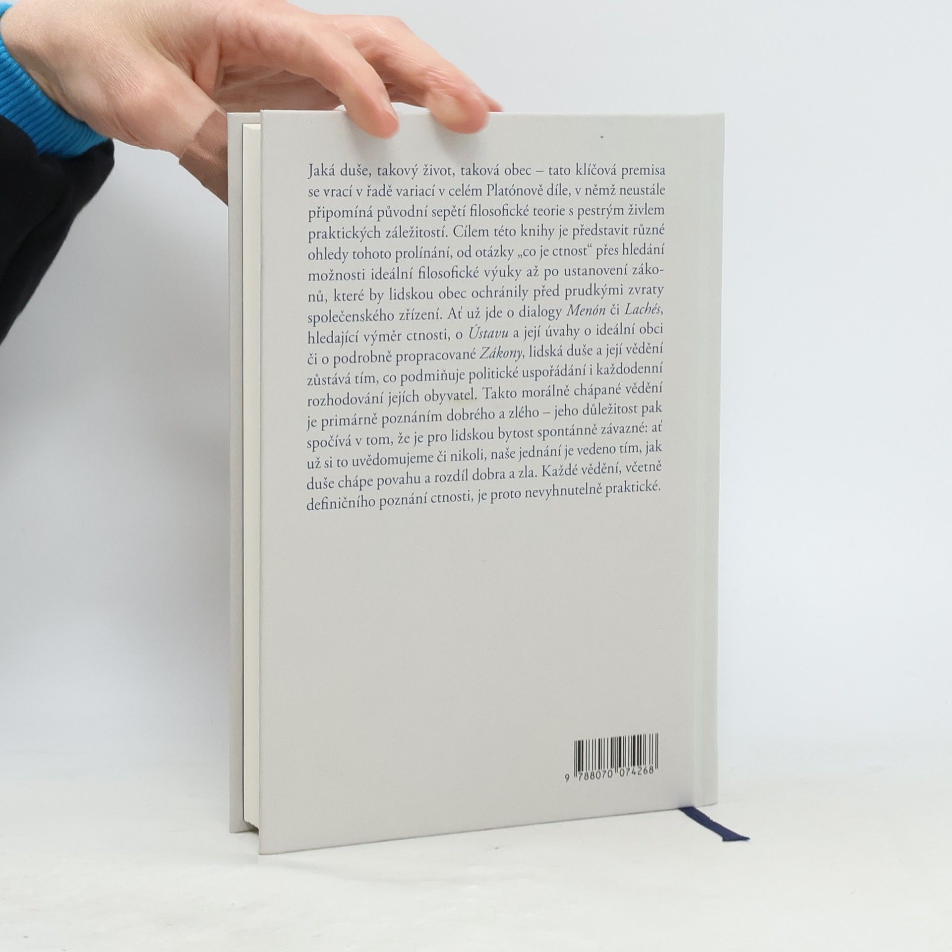Podtitul: K Platónově praktické filosofii Jaká duše, takový život, taková obec – tato klíčová premisa se vrací v řadě variací v celém Platónově díle, v němž neustále připomíná původní sepětí filosofické teorie s pestrým živlem praktických záležitostí. Cílem této knihy je představit různé ohledy tohoto prolínání, od otázky „co je ctnost“ přes hledání možnosti ideální filosofické výuky až po ustanovení zákonů, které by lidskou obec ochránily před prudkými zvraty společenského zřízení. Ať už jde o dialogy Menón či Lachés, hledající výměr ctnosti, o Ústavu a její úvahy o ideální obci, či o podrobně propracované Zákony, lidská duše a její vědění zůstává tím, co podmiňuje politické uspořádání i každodenní rozhodování jejích obyvatel. Takto morálně chápané vědění je primárně poznáním dobrého a zlého – jeho důležitost pak spočívá v tom, že je pro lidskou bytost spontánně závazné: ať už si to uvědomujeme či nikoli, naše jednání je vedeno tím, jak duše chápe povahu a rozdíl dobra a zla. Každé vědění, včetně definičního poznání ctnosti, je proto nevyhnutelně praktické.