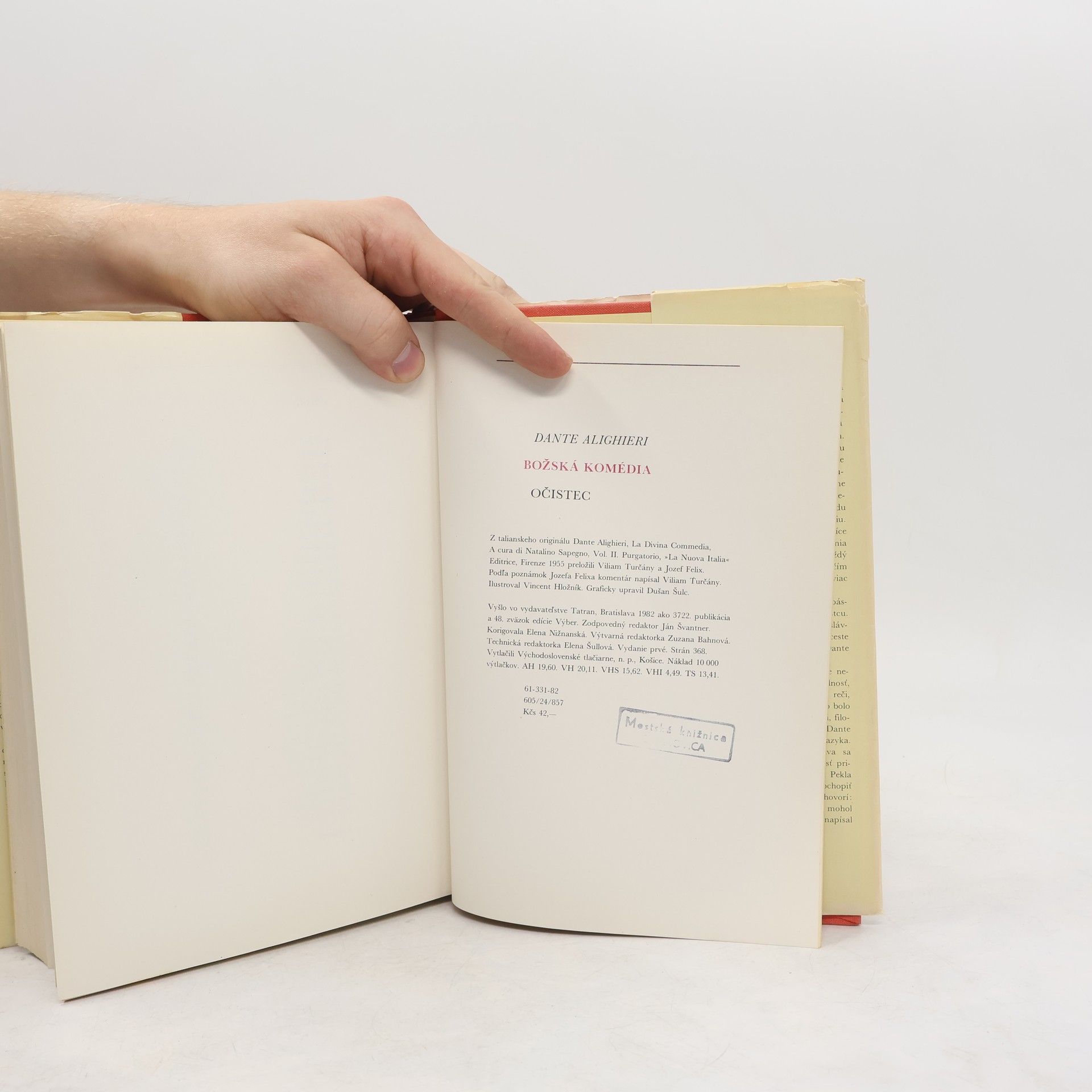 Kniha je druhou časťou slávnej a legendárnej La Divina Comedia. Dante a jeho sprievodca Vergílius pokračujú vo svojom putovaní za stratenou láskou Beatrice. Ich cesty vedú z pekla, po prelezení skrze diabla, ktorý naveky požiera dušu Judášovu, na protipól sveta mystického do očistca. Tu stretávajú duše tých, ktorí neboli na veky zatratení, ale ich duša nebola v stave blaženosti, v čase smrti ich telesnej schránky, ktorá je nutná k priamemu prechodu do bázne nebeskej a blízkosti Boha trojjedinného. Prvé vydanie. Komentár podľa poznámok J. Felixa napísal Viliam Turčány.