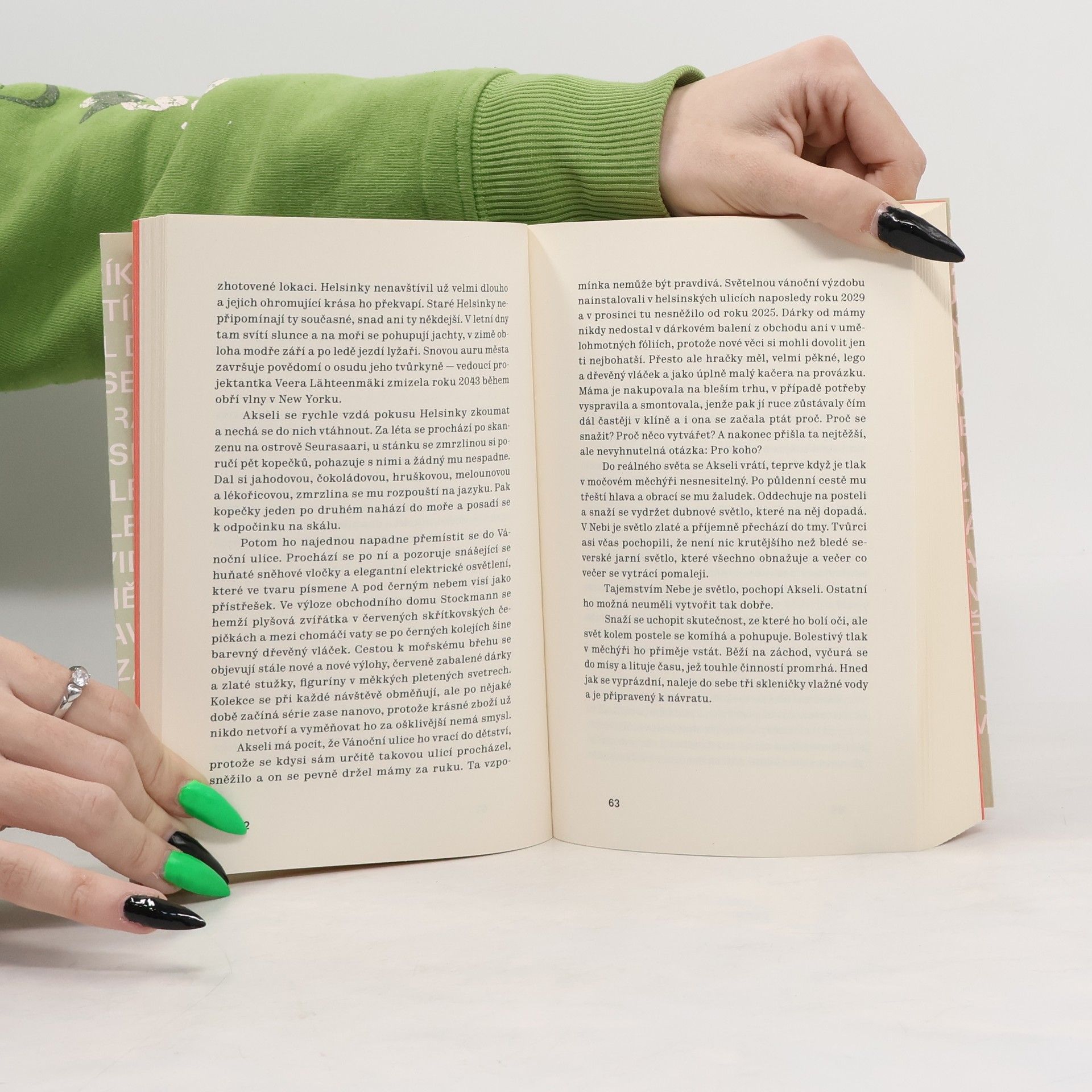Píše se rok 2058, svět zdevastovaly přírodní katastrofy. Obyvatelům Helsinek, kde po občanské válce vládne totalitní režim, se už dlouho nerodí děti, život postrádá smysl. Jedinou útěchu poskytuje virtuální realita. Přístup do Nebe je ale jen pro ty, kteří si to můžou dovolit. Mladý vědec Akseli dostane od svého nadřízeného na univerzitě výzkumný úkol. Rázem tak v Nebi může trávit daleko více času. Už už se zdá, že se bude oddávat jen jeho opojnému účinku, pak tu ale potká ženu a zatouží po setkání s ní i v reálném světě. Finská spisovatelka Piia Leino vystřihla napínavou dystopickou vizi, v níž se na pozadí milostného příběhu zabývá sílícím vlivem technologií na lidský život, vzrůstající sociální nerovností, nebezpečím nacionalstických ideologií a dalšími palčivými tématy současného světa. Román Nebe sklízí globální úspěch, kniha byla přeložena do téměř dvacítky jazyků.