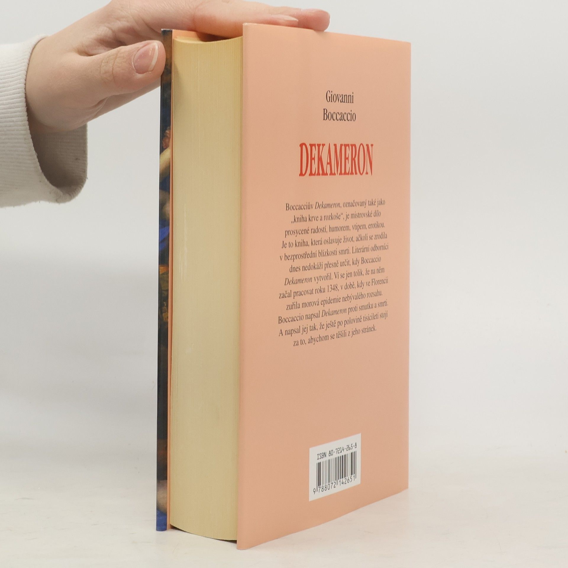Boccaciův Derameron, označovaný také jako " kniha krve a rozkoše". Je to mistrovské renesanční dílo, prosycené radostí, humorem, vtipem, erotikou - dílo, které oslavuje život. Tím víc překvapuje, že se zrodilo v bezprostředním střetu se smrtí. Literární odborníci dnes nedokáží přesně určit, kdy Boccacio Dekameron vytvořil. Ví se jen tolik, že na něm začal pracovat roku 1348, v době, kdy ve Florencii zuřila morová epidemie nebývalého rozsahu. Boccacio napsal Dekameron proti smutku a nemoci. A napsal jej tak, že ještě po polovině tisíciletí stojí za to, abychom se těšili z jeho stránek.