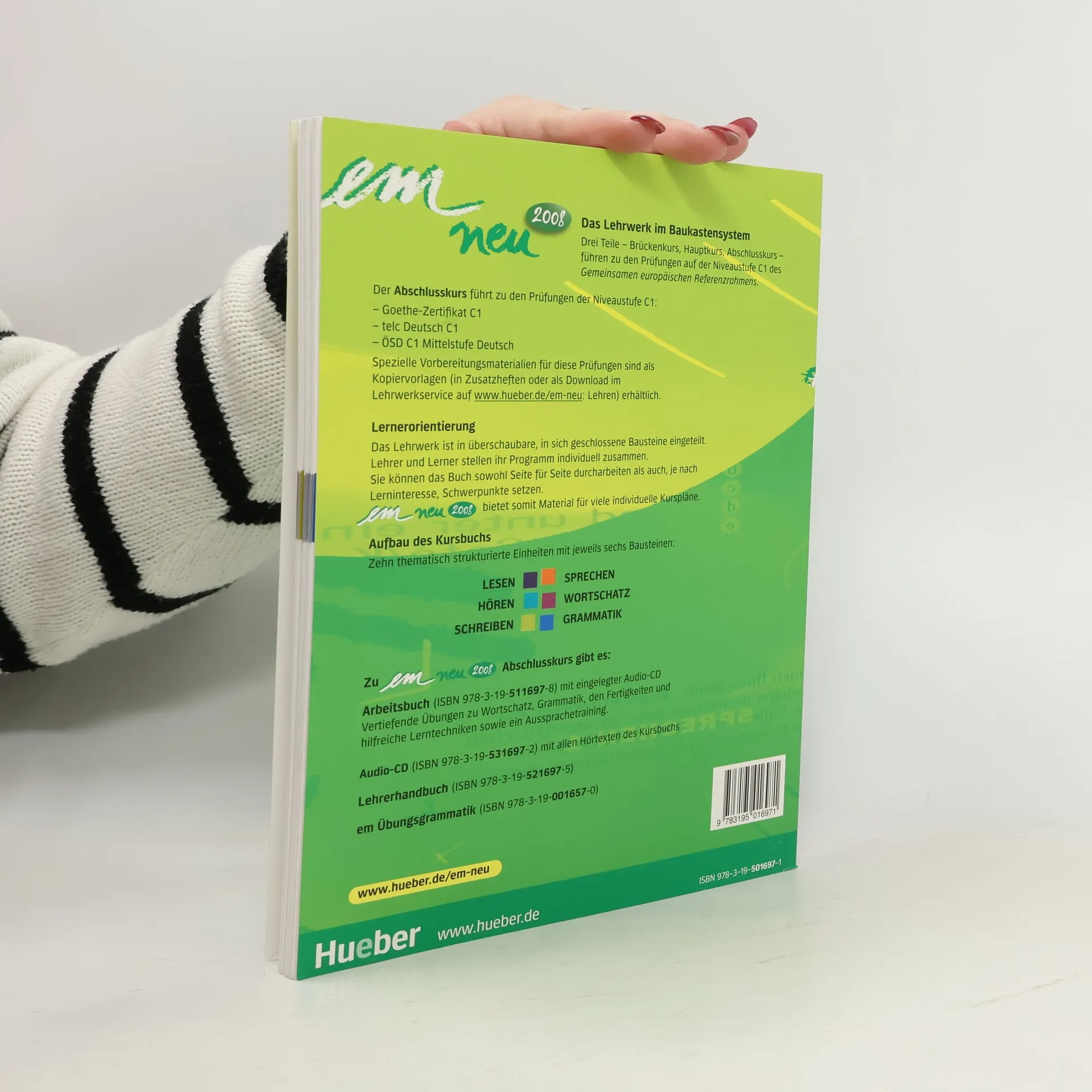 Voraussetzung: Sprachstand der Niveaustufe B2 Lernziel: Sprachbeherrschung auf der Niveaustufe C1 Zur Vorbereitung auf die entsprechenden Prüfungen von Goethe-Institut, telc und ÖSD gibt es kostenlose Zusatzhefte bzw. Downloadmaterialien im Lehrwerkservice (http://www.hueber.de/sixcms/list.php'page=pg_lehren_pruefungsvorb_emn). Zusatzmaterialien zu weiteren C1-Prüfungen sind in Vorbereitung.