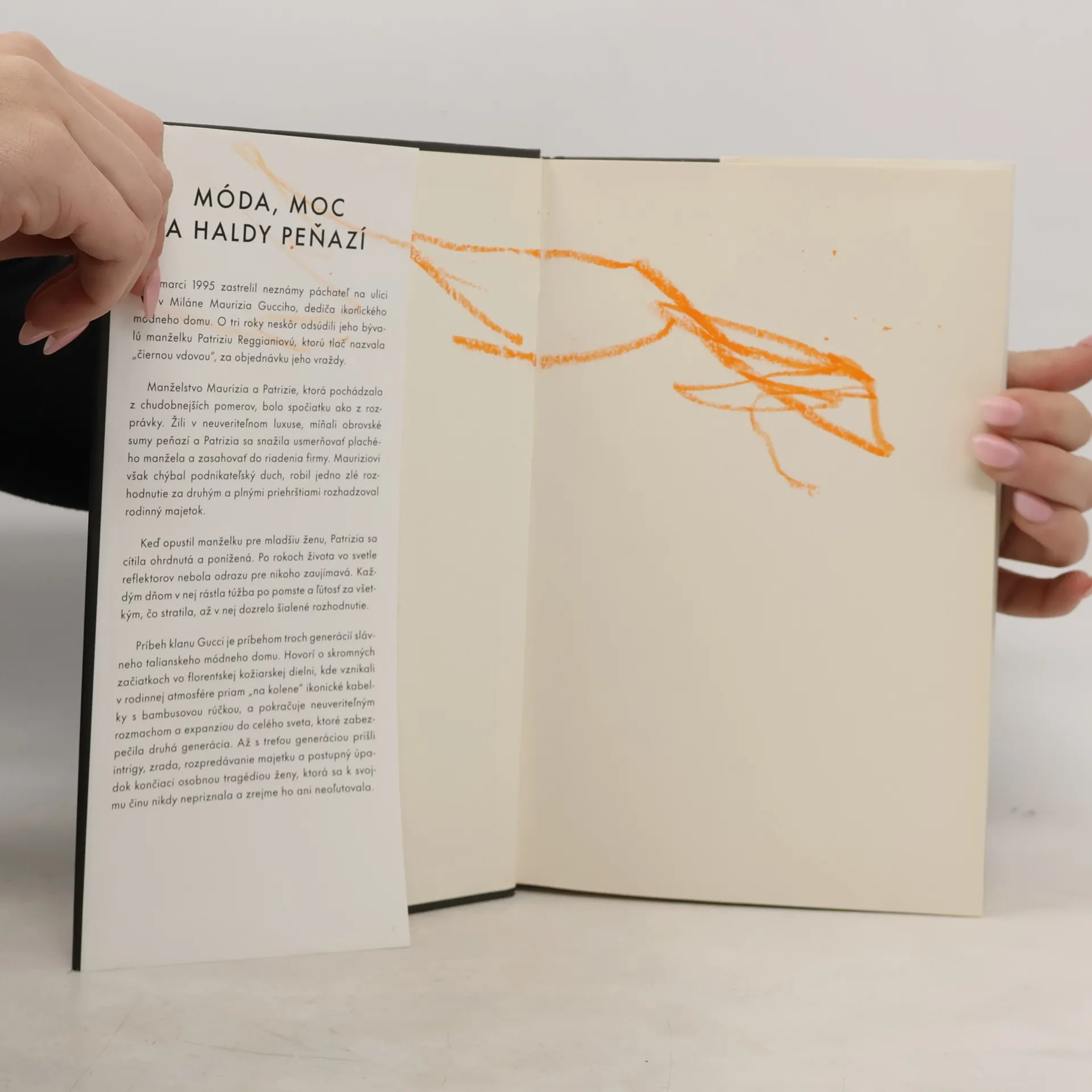 Skutočný príbeh o šialenstve, vražde a chamtivosti, ktoré otriasli dynastiou Gucciovcov. 27. marca 1995 neznámy strelec zabil Maurizia Gucciho, dediča módnej dynastie. V roku 1998 bola jeho bývalá manželka Patrizia Reggiani Martinelliová – v tlači prezývaná „Čierna vdova“ – odsúdená na 29 rokov väzenia za prípravu vraždy. Bola to vražda z pomsty alebo zo žiarlivosti? A vraždila naozaj Patrizia? Kniha je príbehom slávy, intríg, vzostupu, pádu a následného oživenia módneho klanu Gucciovcov.