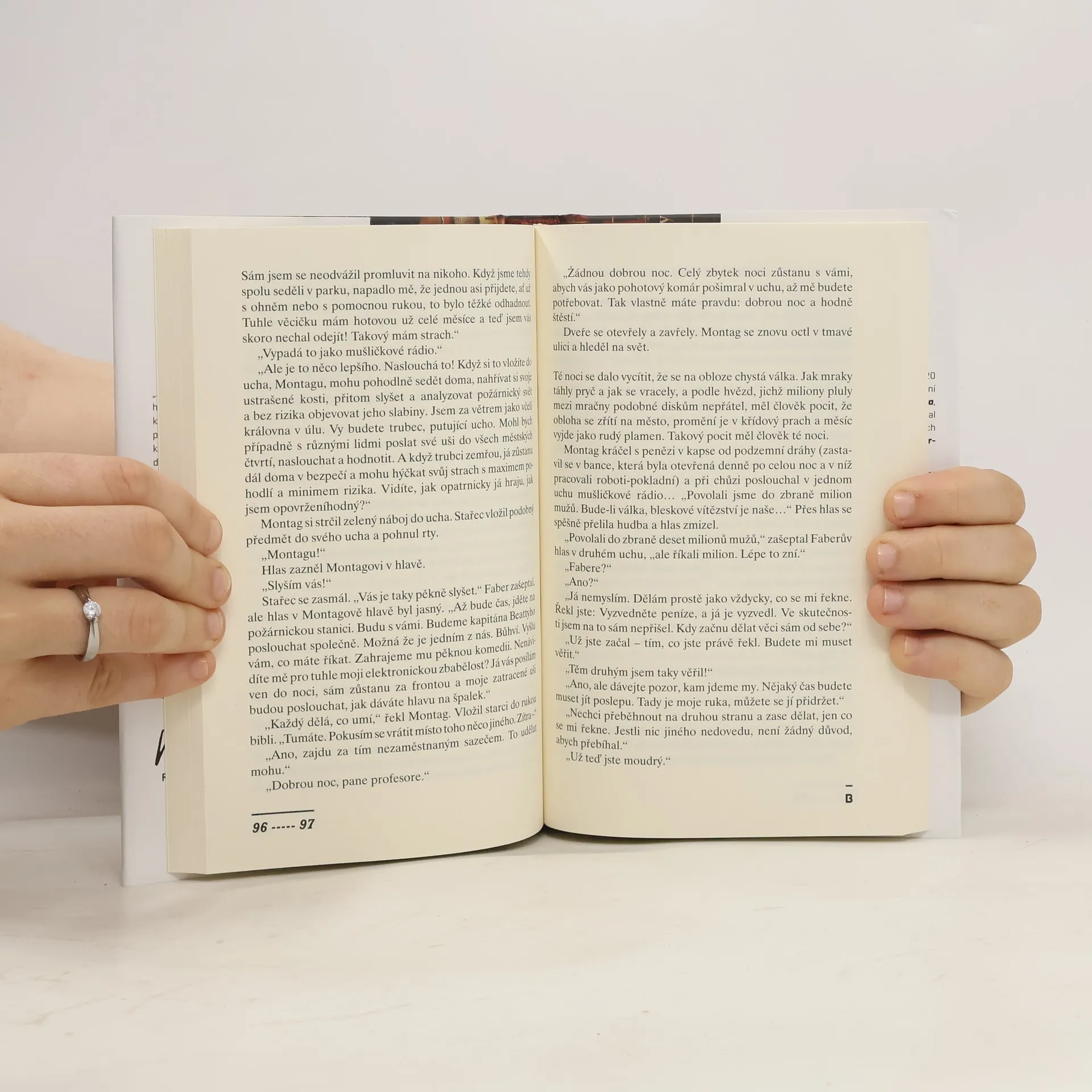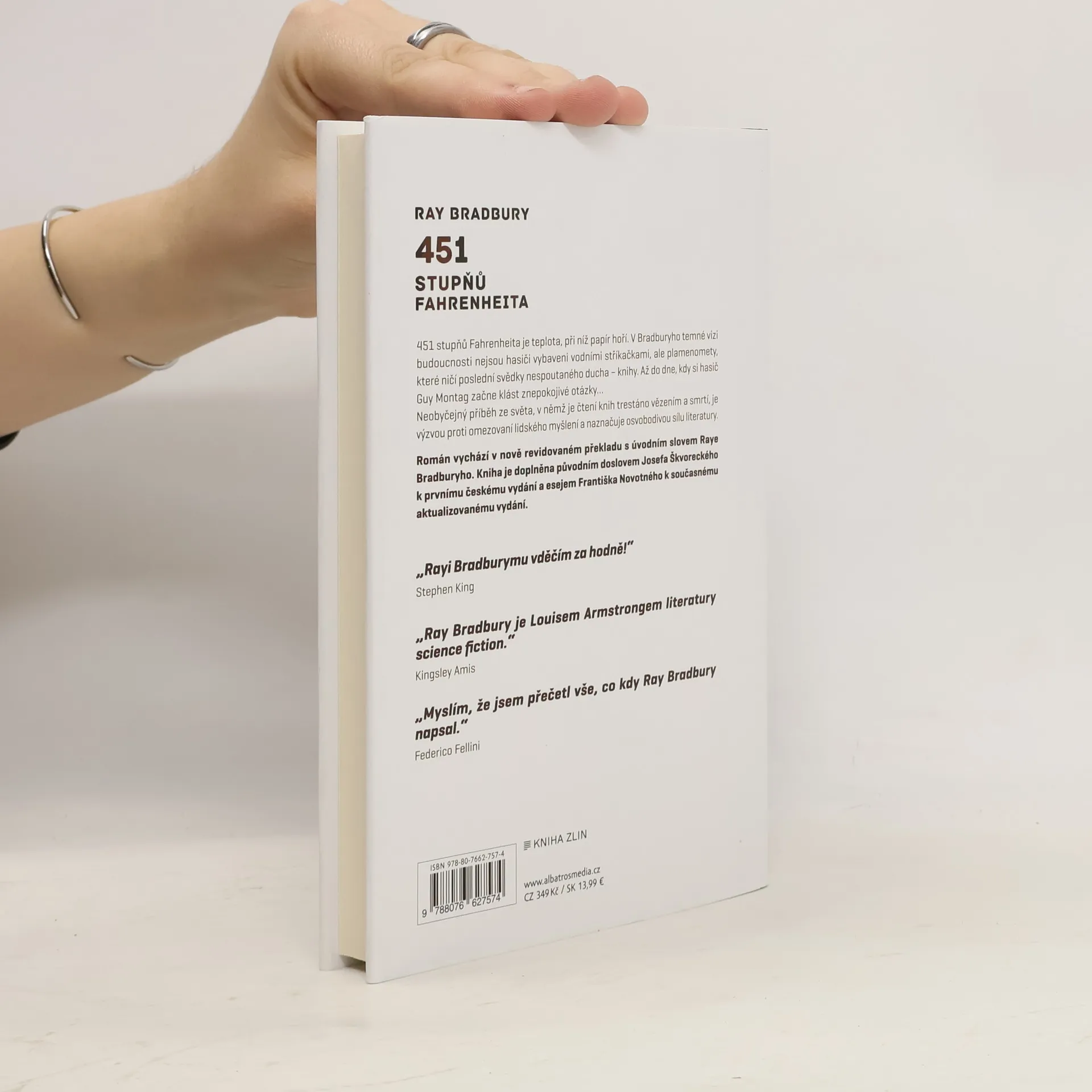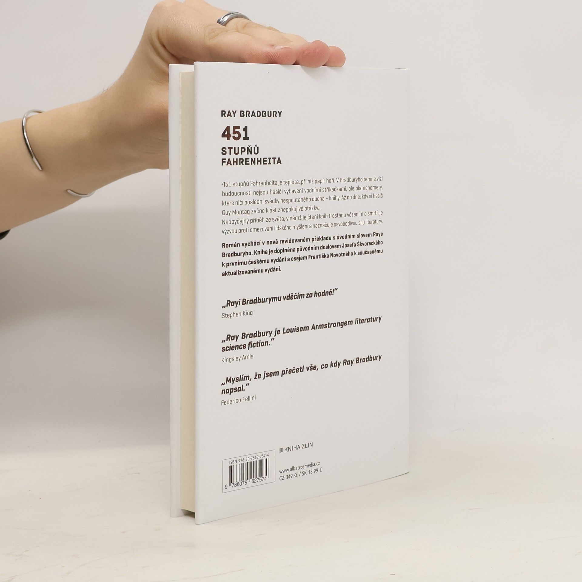 451 stupňů Fahrenheita je teplota, při níž papír hoří. V Bradburyho temné vizi budoucnosti nejsou hasiči vybaveni vodními stříkačkami, ale plamenomety, které ničí poslední svědectví svobodného myšlení – knihy. Až do dne, kdy si hasič Guy Montag začne klást znepokojivé otázky… Román vychází v nově revidovaném překladu s úvodním slovem Raye Bradburyho. Kniha je doplněna původním doslovem Josefa Škvoreckého k prvnímu českému vydání a esejem Františka Novotného k současnému aktualizovanému vydání.