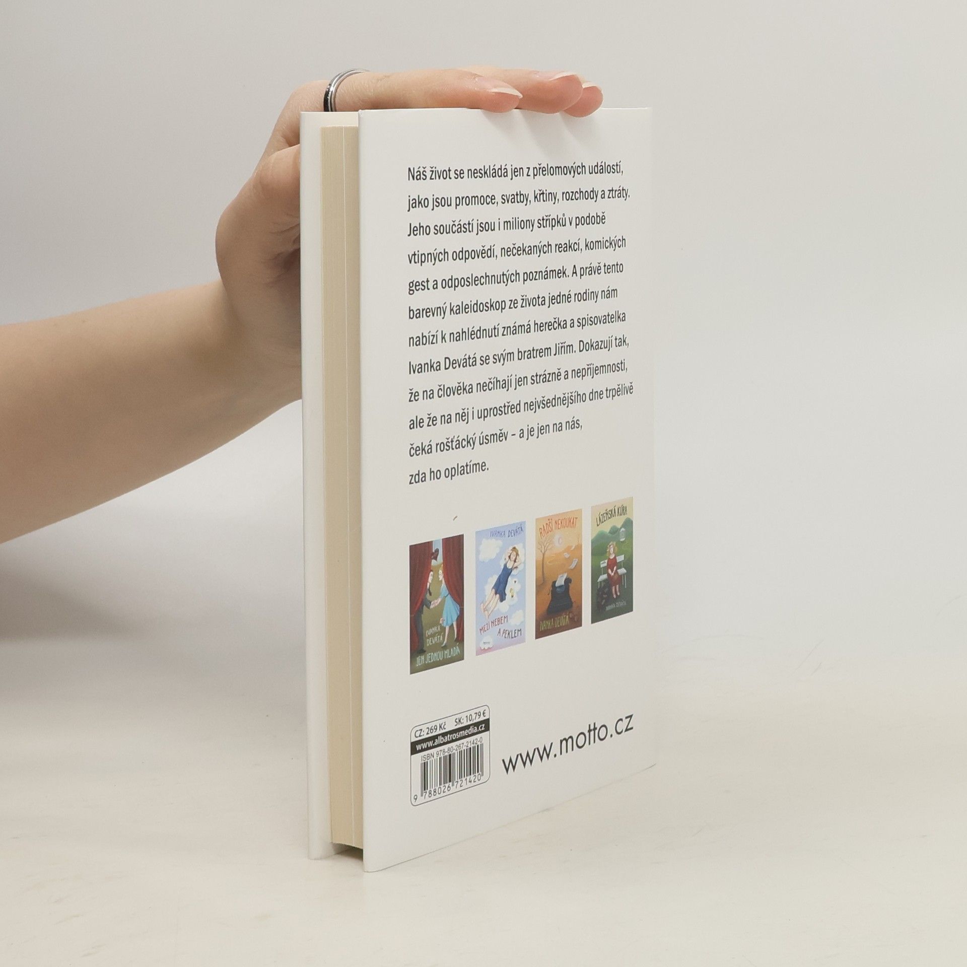 Náš život se neskládá jen z přelomových událostí, jako jsou promoce, svatby, křtiny, rozchody a ztráty. Jeho součástí jsou i miliony střípků v podobě vtipných odpovědí, nečekaných reakcí, komických gest a odposlechnutých poznámek. A právě tento barevný kaleidoskop ze života jedné rodiny nám nabízí k nahlédnutí známá herečka a spisovatelka Ivanka Devátá se svým bratrem Jiřím.