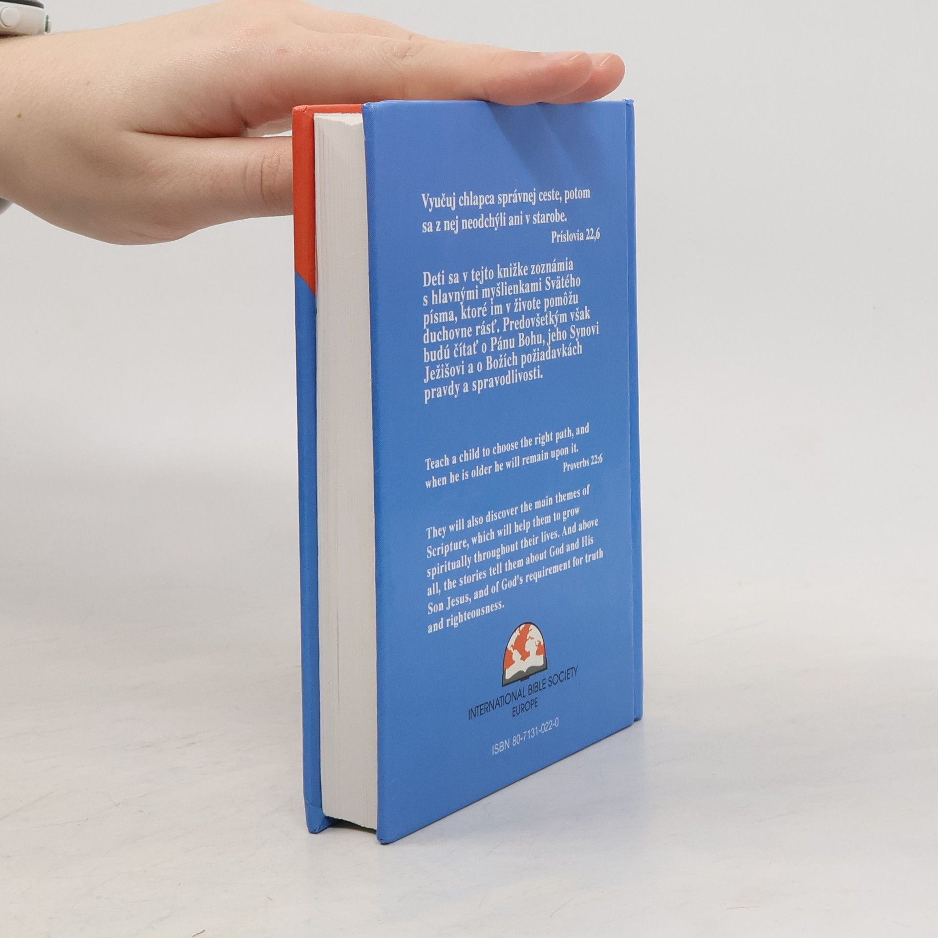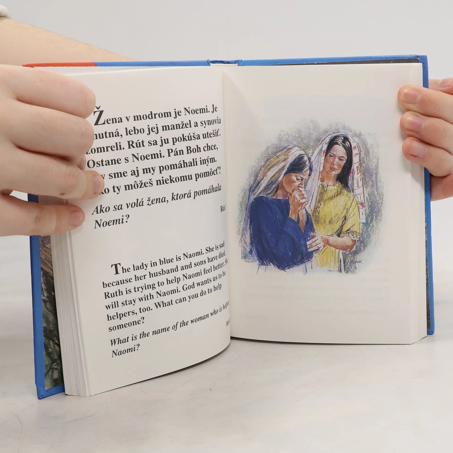 children's bible with passages in both English and Slovak on the same page. Each passage is accompanied by an illustration of the passage.