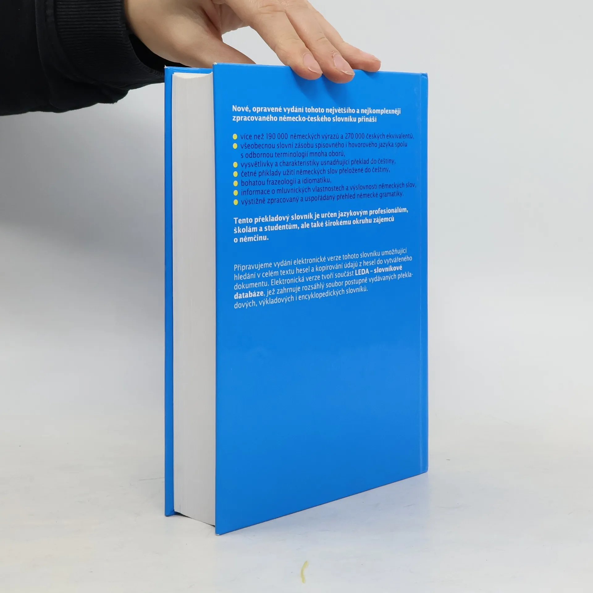 První vydání (SPN, 1964) vyšlo pod názvem Německo-český slovník. Nové, opravené vydání našeho největšího německo-českého slovníku vzniklého v minulém století. V komplexně zpracovaných heslech přináší všeobecnou slovní zásobu jazyka (i v jeho hovorových a expresivních významech)spolu s odbornou a vědeckou terminologií mnoha oborů. Všechny příklady použití jsou uváděny s českým překladem, bohatě jsou zastoupena ustálená slovní spojení včetně idiomatických výrazů; hesla jsou v dostatečné míře vybavena gramatickým a výslovnostním aparátem. Slovník je vybaven přehledem německé gramatiky a je určen překladatelům, studentům pokročilejších úrovní a všem zájemcům o němčinu. (7., oprav. vydání, v nakl. Leda vydání 1.) Slovník je z technických důvodů rozdělen do dvou svazků - sv. 1 (A-L), sv. 2 (M-Z)