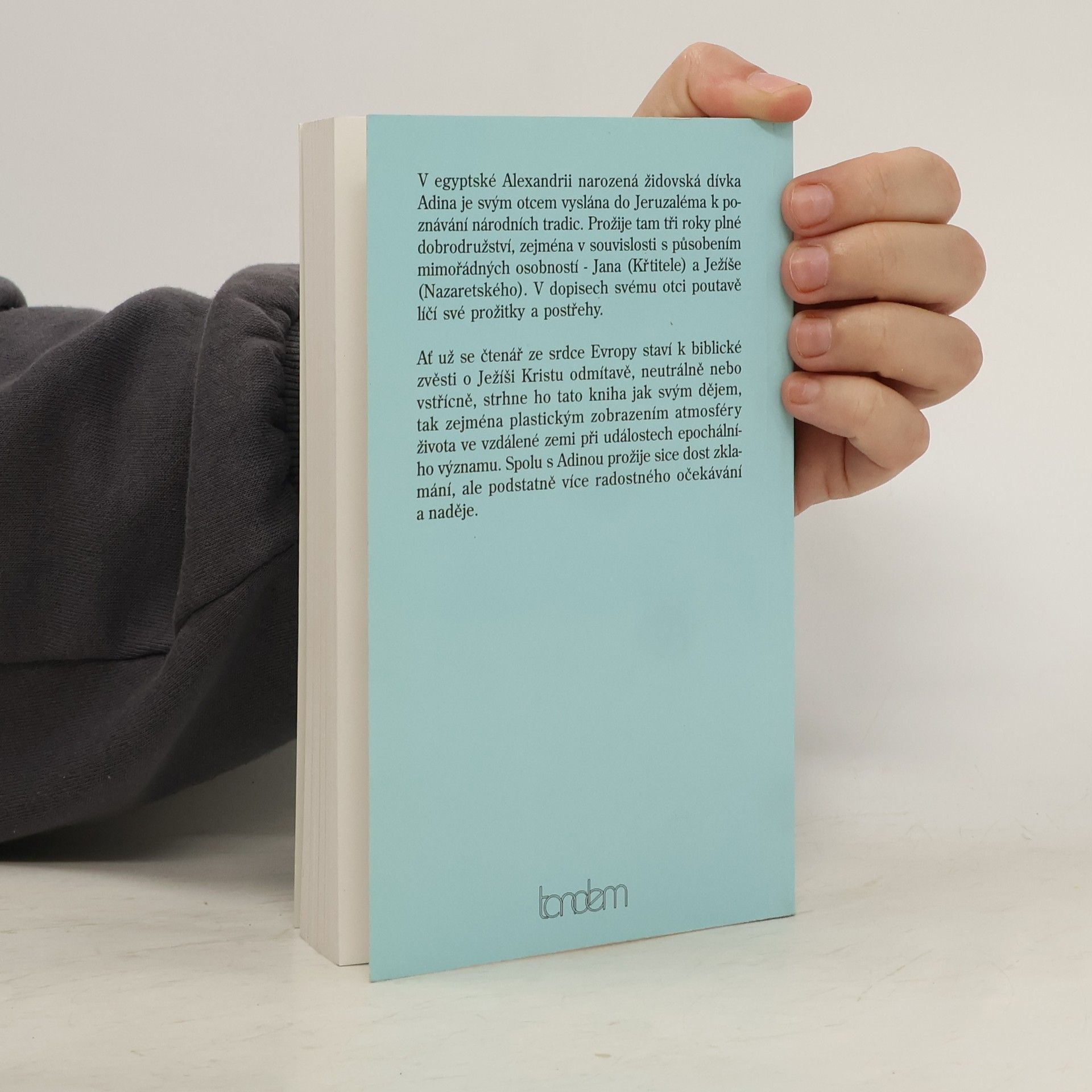V egyptské Alexandrii narozená židovská dívka Adina je svým otcem vyslána do Jeruzaléma k poznávání národních tradic. Prožije tam tři roky plné dobrodružství, zejména v souvislosti s působením mimořádných osobností - Jana (Křtitele) a Ježíše (Nazaretského). V dopisech svému otci poutavě líčí své prožitky a postřehy. Ať už se čtenář ze srdce Evropy staví k biblické zvěsti o Ježíši Kristu odmítavě, neutrálně nebo vstřícně, strhne ho tato kniha jak svým dějem, tak zejména plastickým zobrazením atmosféry života ve vzdálené zemi při událostech epochálního významu. Spolu s Adinou prožije sice dost zklamání, ale podstatně více radostného očekávání naděje.