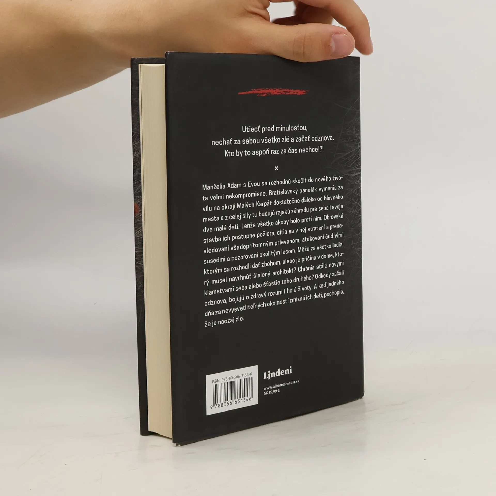 Nový desivý a napínavý krimi román slovenského autora Petra Derňára.Utiecť pred minulosťou, nechať za sebou všetko zlé a začať odznova. Kto by to aspoň raz za čas nechcel?! Manželia Adam s Evou sa rozhodnú skočiť do nového života veľmi nekompromisne. Bratislavský panelák vymenia za vilu na okraji Malých Karpát dostatočne ďaleko od hlavného mesta a z celej sily tu budujú rajskú záhradu pre seba i svoje dve malé deti. Lenže všetko akoby bolo proti nim. Obrovská stavba ich postupne požiera, cítia sa v nej stratení a prenasledovaní všadeprítomným prievanom, atakovaní čudnými susedmi a pozorovaní okolitým lesom. Môžu za všetko ľudia, ktorým sa rozhodli dať zbohom, alebo je príčina v dome, ktorý musel navrhnúť šialený architekt? Chránia stále novými klamstvami seba alebo šťastie toho druhého? Odkedy začali odznova, bojujú o zdravý rozum i holé životy. A keď jedného dňa za nevysvetliteľných okolností zmiznú ich deti, pochopia, že je naozaj zle.