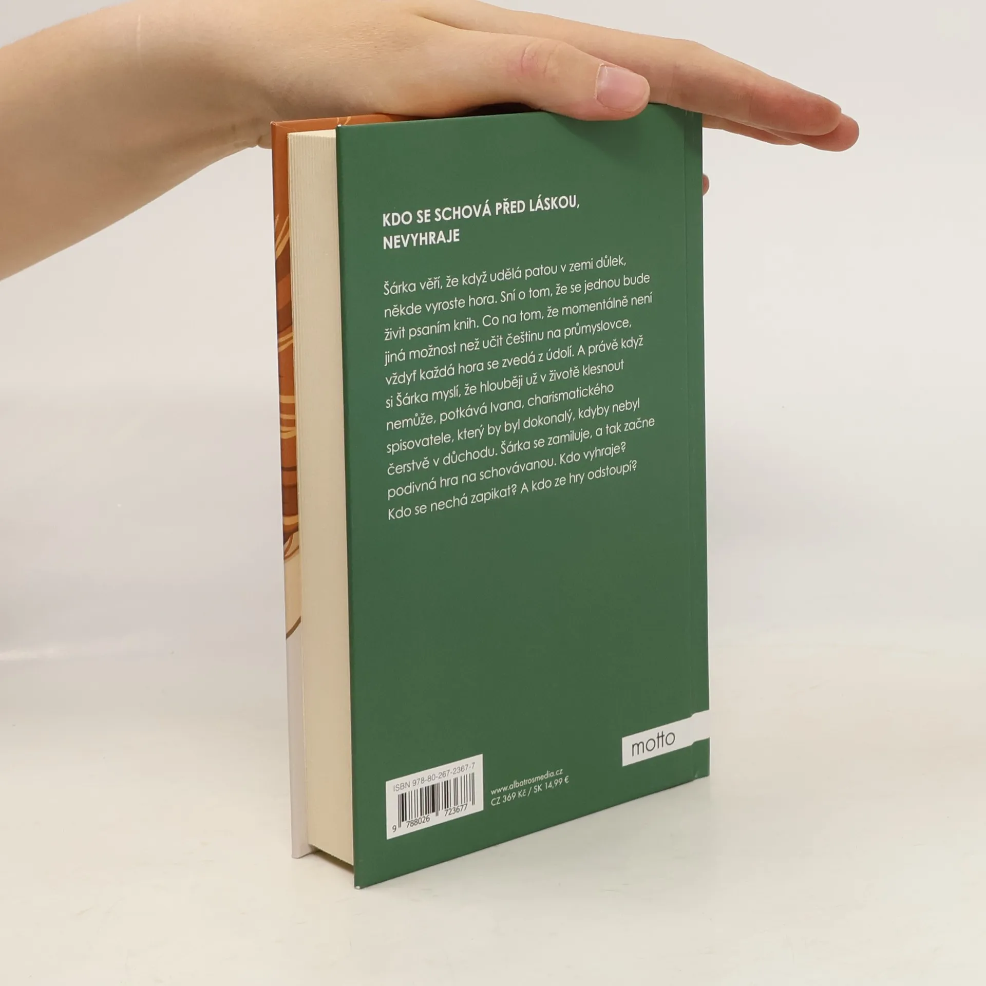 Kdo se schová před láskou, nevyhraje Šárka věří, že když udělá patou v zemi důlek, někde vyroste hora. Sní o tom, že se jednou bude živit psaním knih. Co na tom, že momentálně není jiná možnost než učit češtinu na maloměstské průmyslovce, vždyť každá hora se zvedá z údolí. V nížinách jejího života to ale právě chaoticky bzučí jako v úlu – matka randí s mladším kolegou, otec prchá k bigbítu a k pivu, bratr má silnou slabost pro marihuanu, babička trpí alzheimerem, cynický kolega srší nesnesitelným sarkasmem a Šárčin přítel David je čím dál tím víc mimo… vztah. A právě když si Šárka myslí, že hlouběji už v životě klesnout nemůže, potkává Ivana, charismatického spisovatele, který by byl dokonalý, kdyby nebyl čerstvě v důchodu. Šárka se zamiluje, a tak začne podivná hra na schovávanou. Kdo vyhraje? Kdo se nechá zapikat? A kdo ze hry odstoupí?