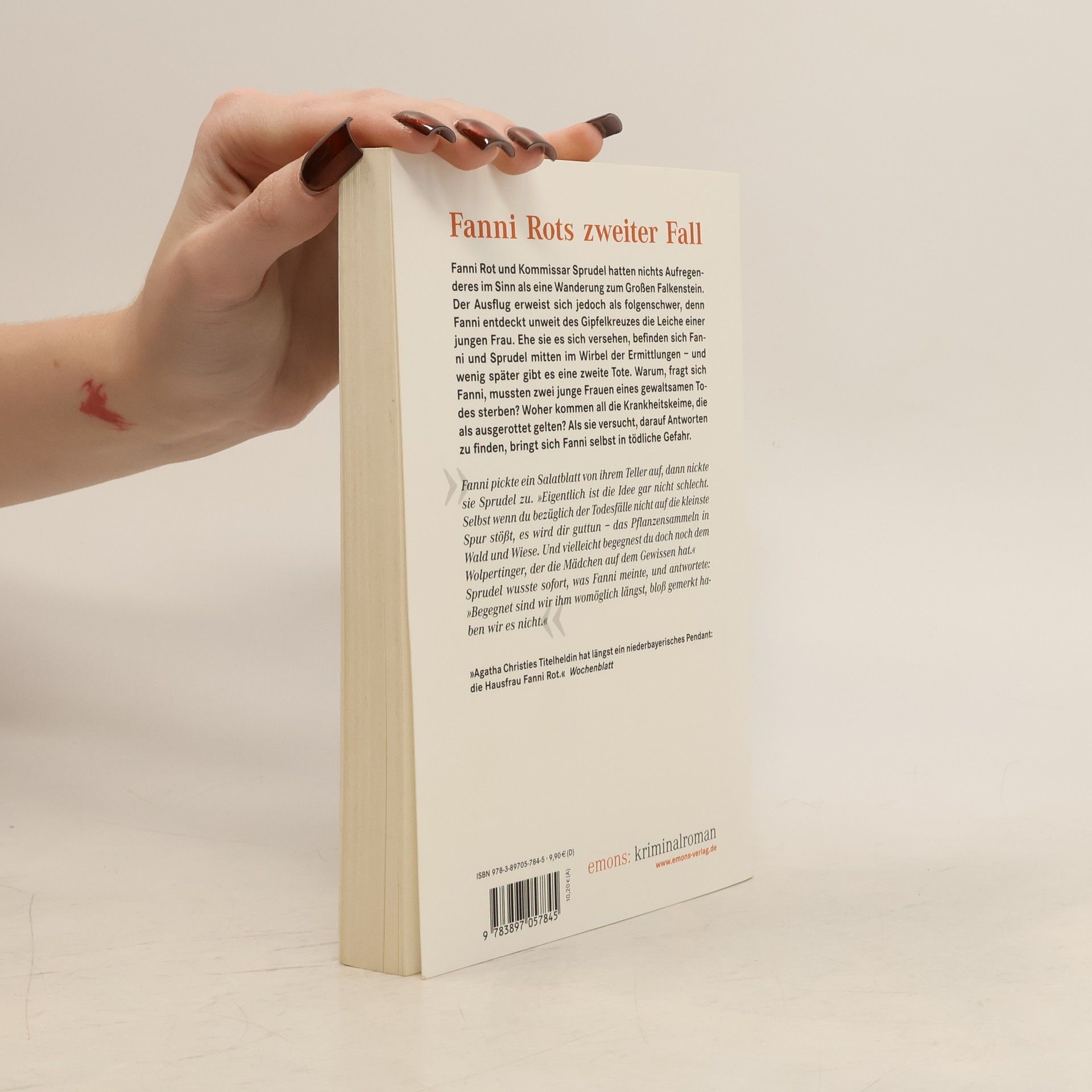 Fanni Rot und Kommissar Sprudel hatten nichts Aufregenderes im Sinn als eine Wanderung zum Großen Falkenstein. Der Ausflug erweist sich jedoch als folgenschwer, denn Fanni entdeckt unweit des Gipfelkreuzes die Leiche einer jungen Frau. Ehe sie es sich versehen, befinden sich Fanni und Sprudel mitten im Wirbel der Ermittlungen – und wenig später gibt es eine zweite Tote. Warum, fragt sich Fanni, mussten zwei junge Frauen eines gewaltsamen Todes sterben? Woher kommen all die Krankheitskeime, die als ausgerottet gelten? Als sie versucht, darauf Antworten zu finden, bringt sich Fanni selbst in tödliche Gefahr.