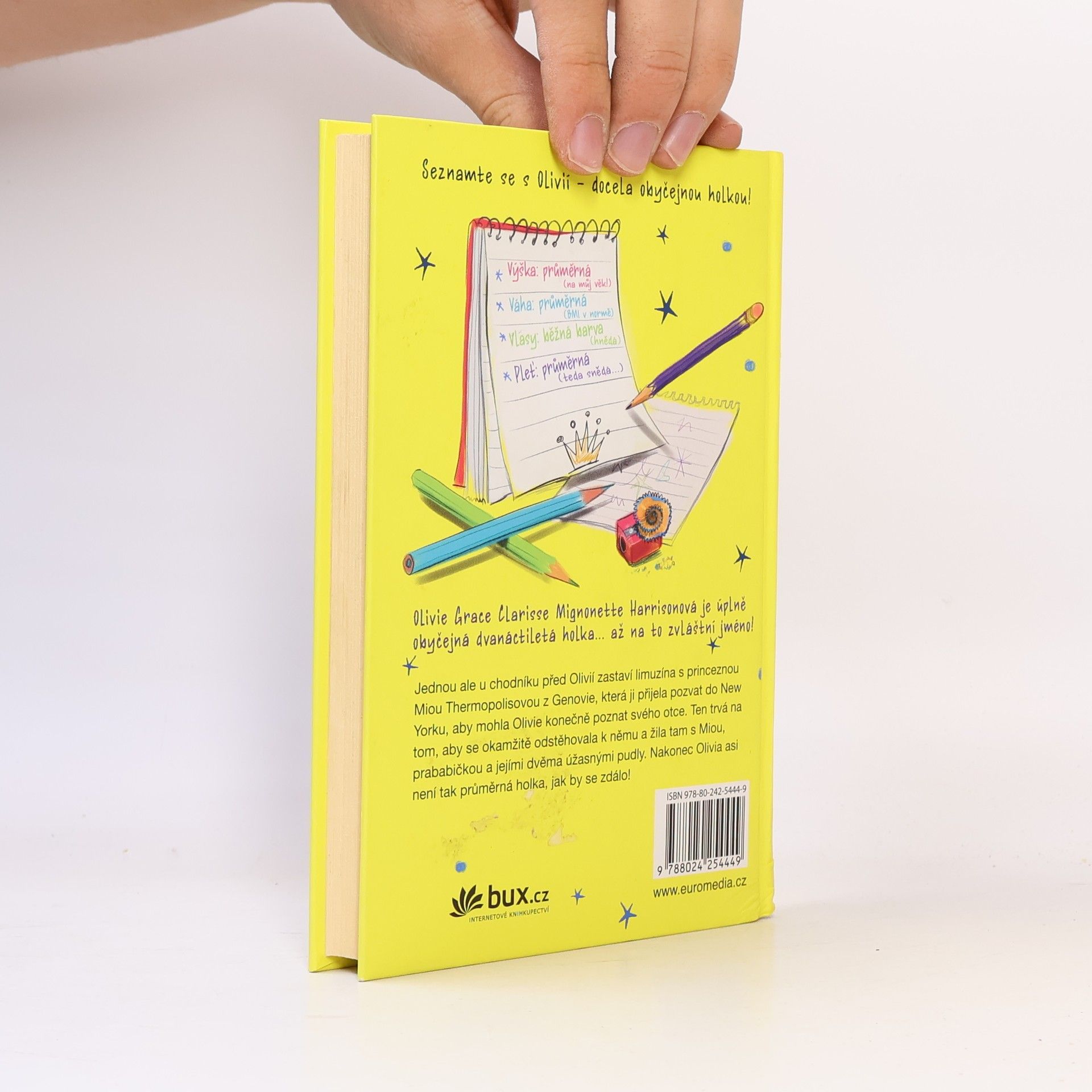 Olivie je úplně obyčejná dvanáctiletá slečna: průměrně vysoká, ani tlustá ani hubená, průměrně hnědé vlasy průměrné délky a průměrně oříškově hnědé oči. Zajímavá je na ní na první pohled jen řada nebývalých křestních jmen, schopnost nádherně kreslit zvířata a to, že je poloviční sirotek, který nezná svého otce a musí bydlet u tety a strýčka. Ti se o ni starají jako o vlastní, takže nemá nejmenší důvod si stěžovat. Jednoho dne se však na Olivii začnou sypat průšvihy. Třídní primadona vyhrožuje, že ji zbije, dostane ředitelskou důtku a připlete se do nehody na autobusové zastávce. Pak ale u chodníku zastaví limuzína s princeznou Miou Thermopolisovou z Genovie, která ji přijela pozvat do New Yorku, aby Olivia mohla konečně poznat svého otce. Ten trvá na tom, aby se okamžitě odstěhovala k němu a žila tam s Miou, prababičkou a jejími dvěma úžasnými pudly. Nakonec Olivia asi není tak průměrná, jak by se zdálo!