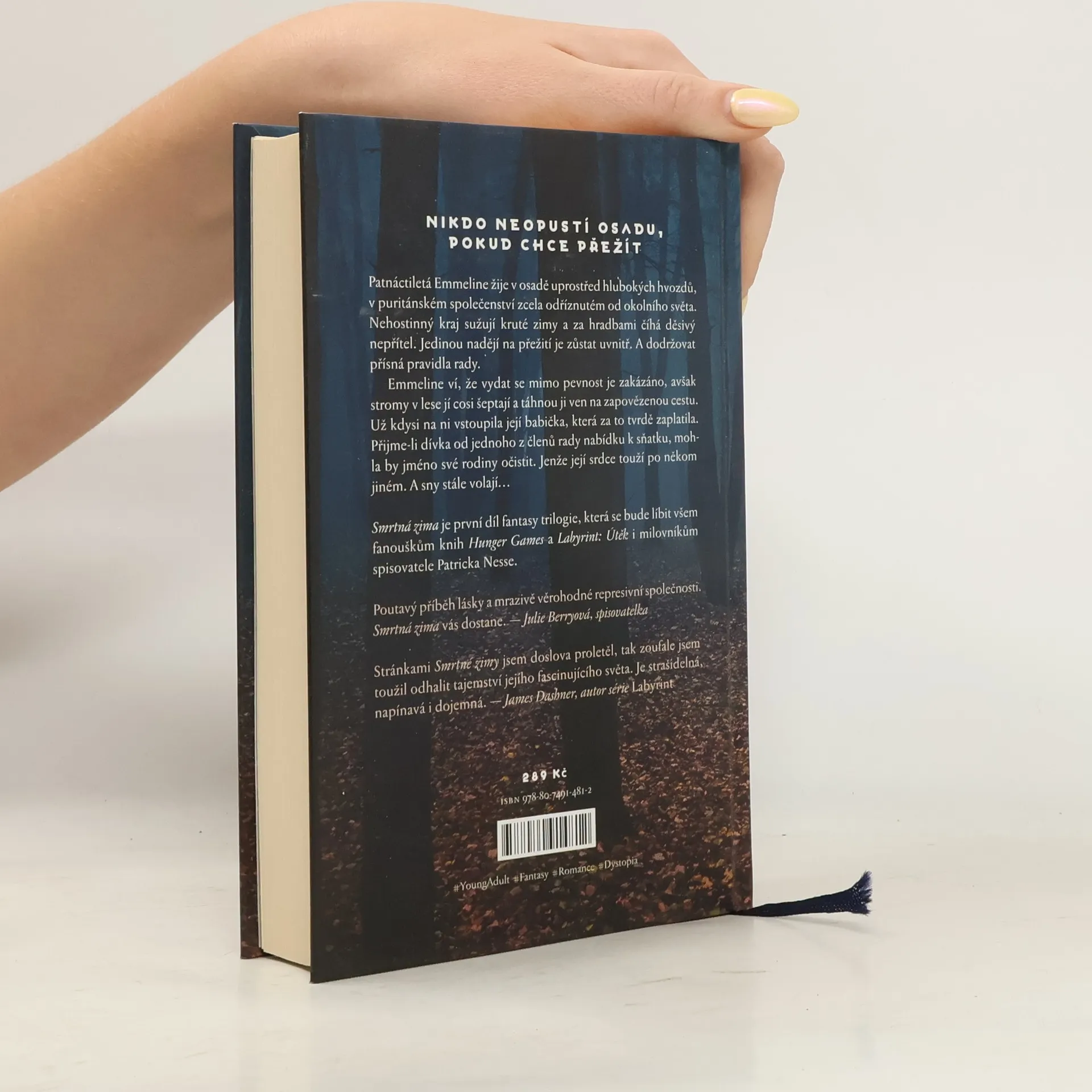 Nikdo neopustí osadu, pokud chce přežít. V imaginárním světě připomínajícím středověk žije v osadě uprostřed tajemných lesů patnáctiletá Emmeline. Puritánská komunita dodržuje přísná pravidla, která mají ochránit její členy před nebezpečím pocházejícím z okolních hvozdů. Emmeline ví, že vydat se mimo osadu je přísně zakázané, avšak stromy v lese jí cosi šeptají a táhnou ji na zapovězenou cestu. Když zůstane tady, čeká ji manželství, o které nestojí, a život vedle kluka, jehož nemůže mít. Ale venku? Malmaci číhá a zima se blíží... Smrtná zima je první díl ohromující nové young adult série, která se bude líbit všem fanouškům knih Hunger Games a Labyrint: Útěk i milovníkům spisovatele Patricka Nesse.