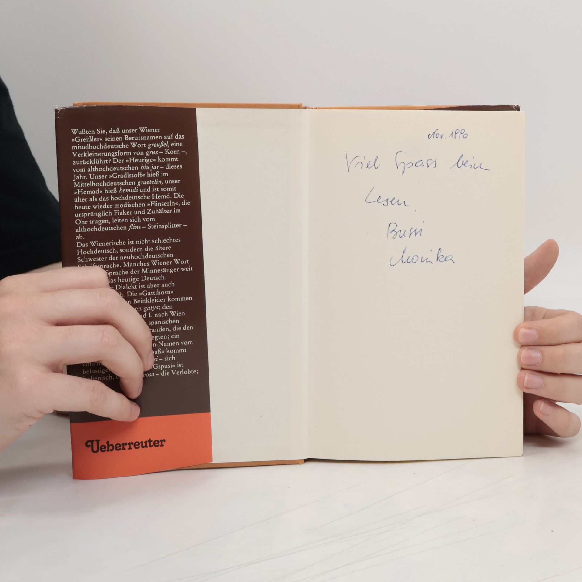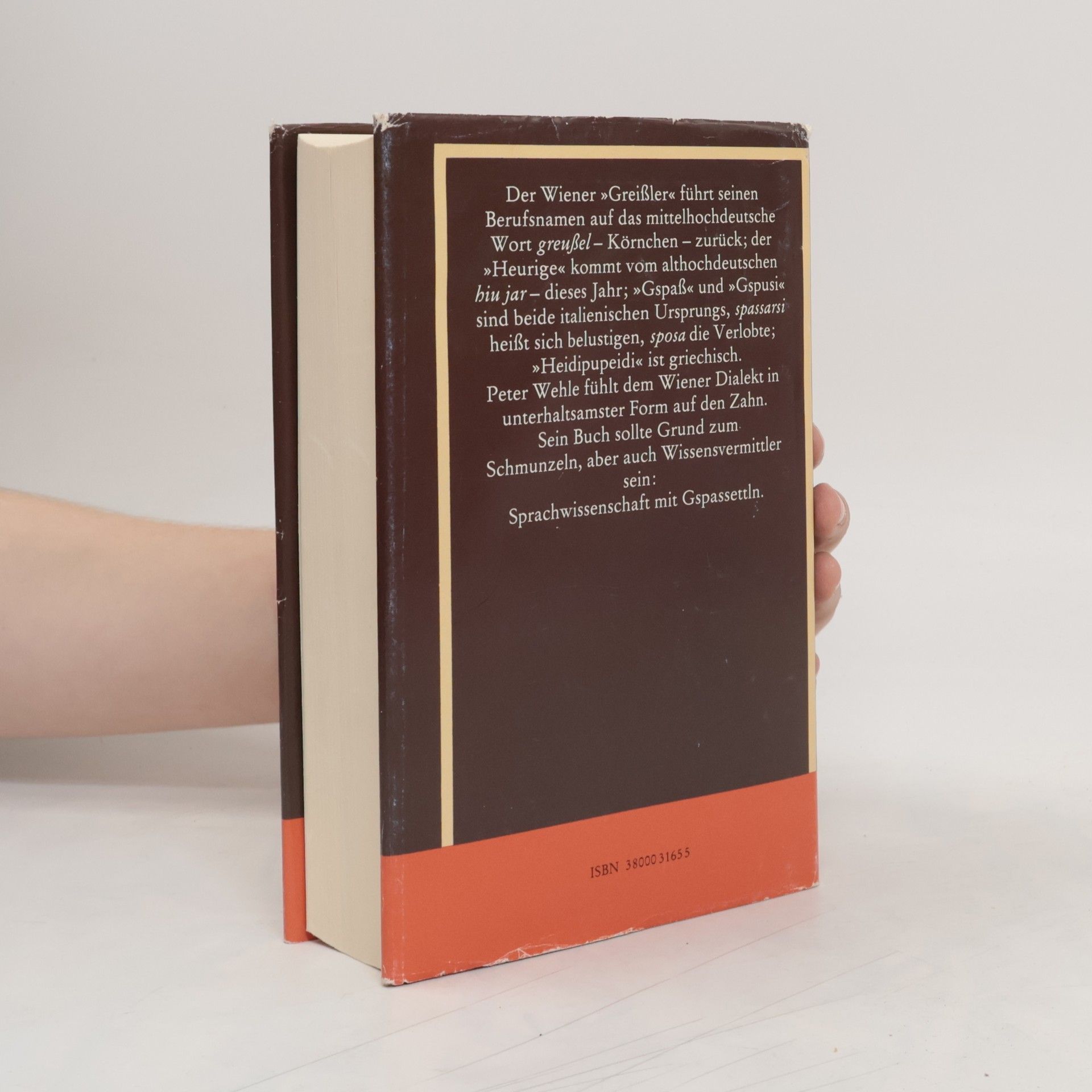Der Wiener „Greißler“ führt seinen Berufsnamen auf das mittelhochdeutsche Wort „greußel“ - Körnchen - zurück; der „Heurige“ kommt vom althochdeutschen „hiu jar“ - dieses Jahr; „Gspaß“ und „Gspusi“ sind beide italienischen Ursprungs, „spassarsi“ heißt sich belustigen, „sposa“ die Verlobte; „Heidipupeidi“ ist griechisch. Peter Wehle fühlt dem Wiener Dialekt in unterhaltsamster Form auf den Zahn. Sein Buch sollte Grund zum Schmunzeln, aber auch Wissensvermittler sein: Sprachwissenschaft mit Gspassettln.