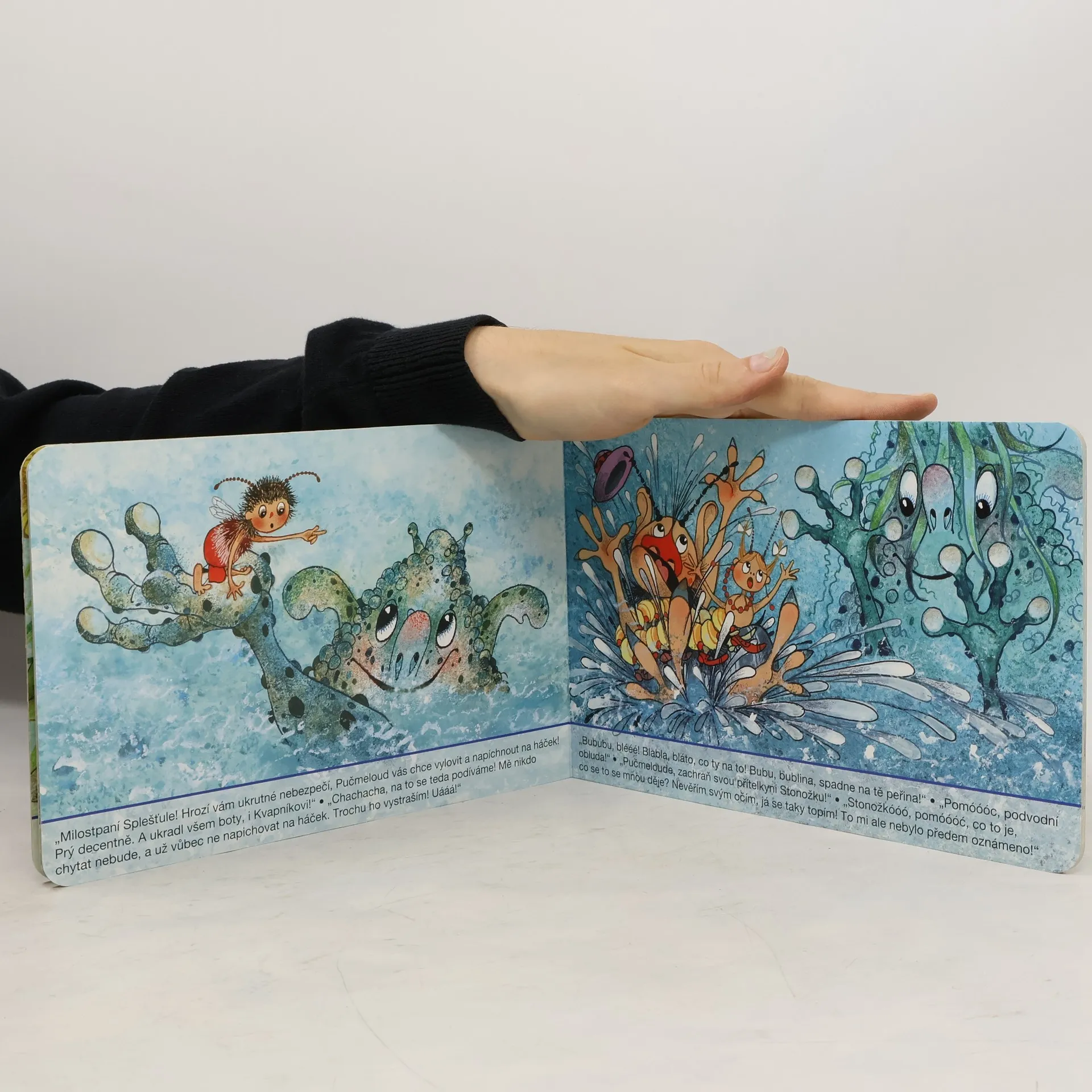 Kdo by neznal včelí medvídky, ať už z knížky, nebo z večerníčků. Tentokrát je i ostatní známé postavičky můžete potkat v leporelu. Pučmeloud totiž vyrazil se Stonožkou na ryby a rozhodl se, že je bude chytat na Spleštuli. Ale nebojte se, paní Splešťule si nedá všechno líbit!