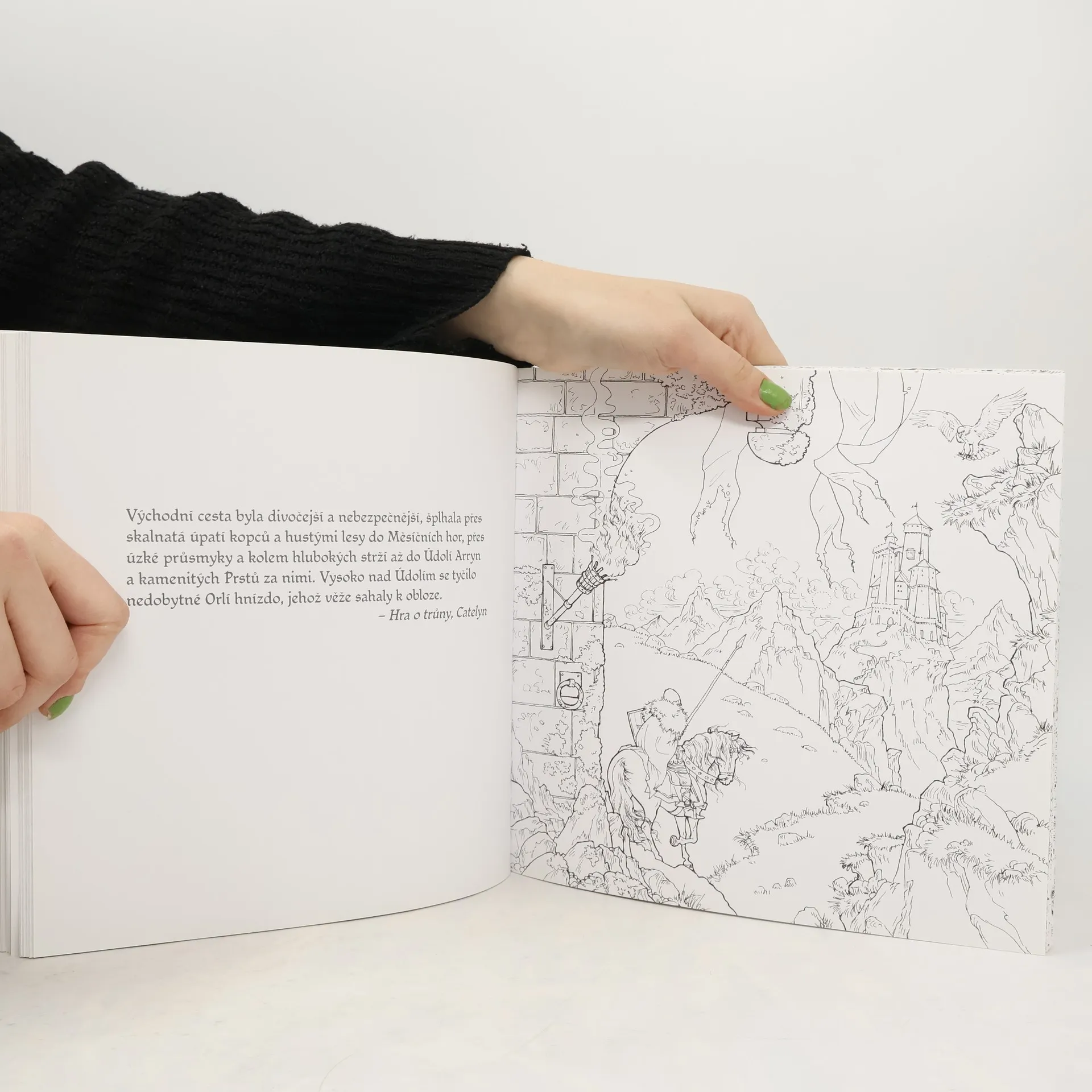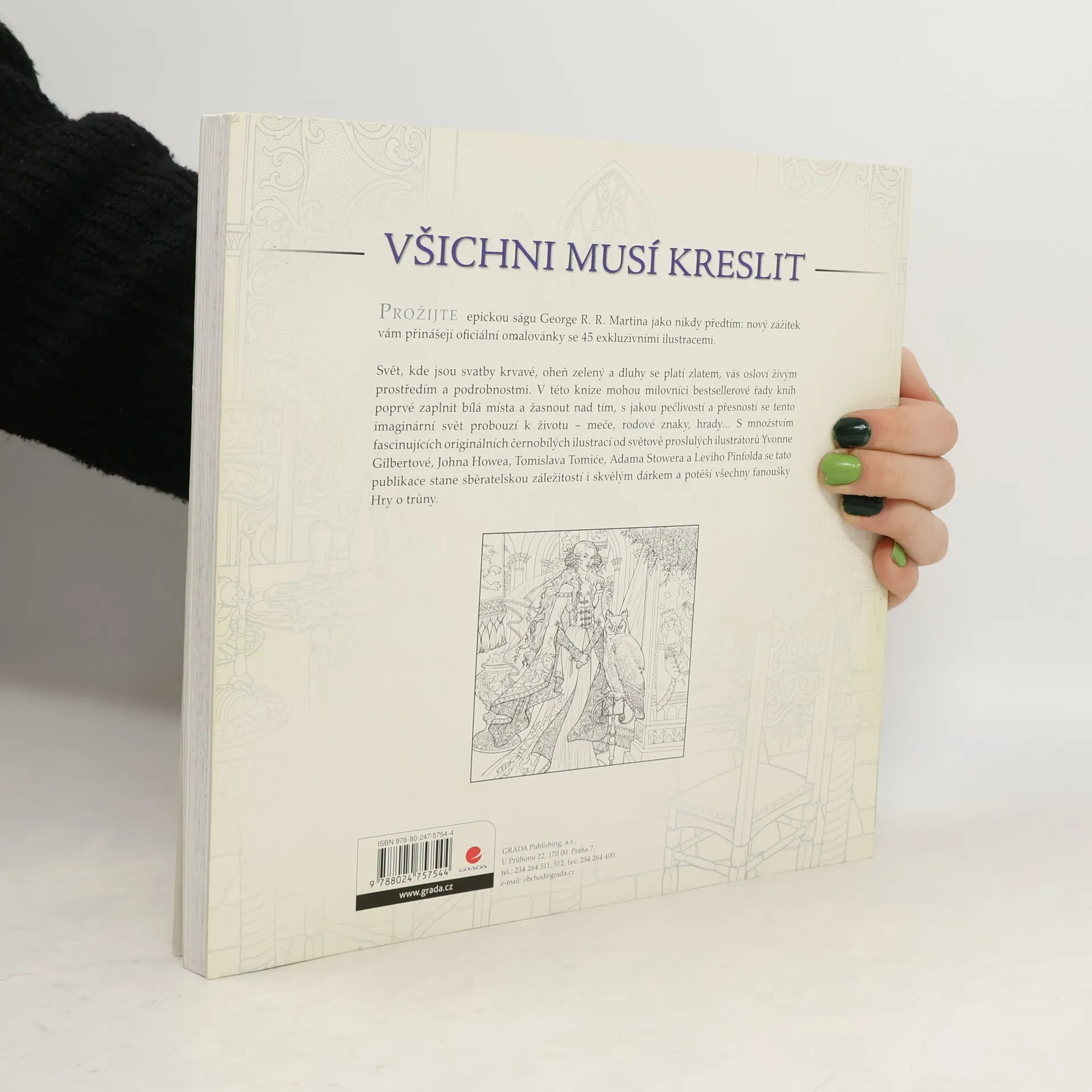 Svět, kde jsou svatby krvavé, oheň zelený a dluhy se platí zlatem, vás osloví živým prostředím a podrobnostmi. V této knize omalovánek mohou milovníci bestsellerové řady knih poprvé zaplnit bílá místa podle své představivosti a žasnout nad tím, s jakou pečlivostí a přesností se tento fantastický svět probouzí k životu – meče, rodové znaky, draci, výjevy z knihy. To vše a ještě mnohem více proložené citáty z knih, díky kterým si dané scény snadno vybavíte. S množstvím fascinujících originálních černobílých ilustrací od světově proslulých ilustrátorů Yvonne Gilbertové, Johna Howea, Tomislava Tomiće, Adama Stowera a Leviho Pinfolda se tato publikace stane sběratelskou záležitostí i skvělým dárkem a potěší všechny fanoušky Hry o trůny. Dejte příběhům z pera George R. R. Martina svůj osobitý styl. Vytvořte si svůj vlastní svět a výjevům z knihy dejte nádech podle vaší aktuální nálady.