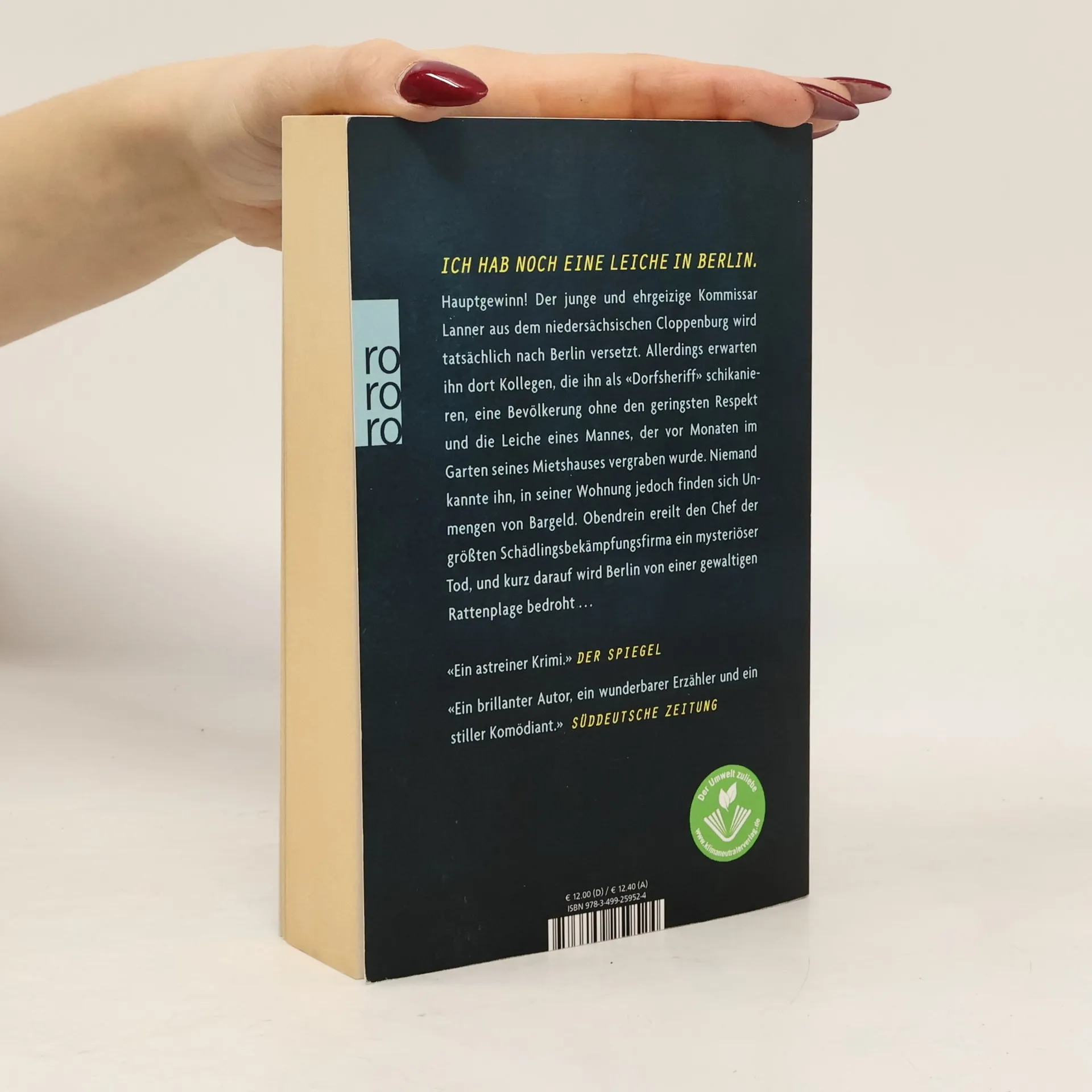 Ich hab noch eine Leiche in Berlin Hauptgewinn! Der junge und ehrgeizige Kommissar Lanner aus dem niedersächsischen Cloppenburg wird tatsächlich nach Berlin versetzt. Allerdings erwarten ihn dort Kollegen, die ihn als «Dorfsheriff» schikanieren, eine Bevölkerung ohne den geringsten Respekt und die Leiche eines Mannes, der vor Monaten im Garten seines Mietshauses vergraben wurde. Niemand kannte ihn, in seiner Wohnung jedoch finden sich Unmengen von Bargeld. Obendrein ereilt den Chef der größten Schädlingsbekämpfungsfirma ein mysteriöser Tod, und kurz darauf wird Berlin von einer gewaltigen Rattenplage bedroht …