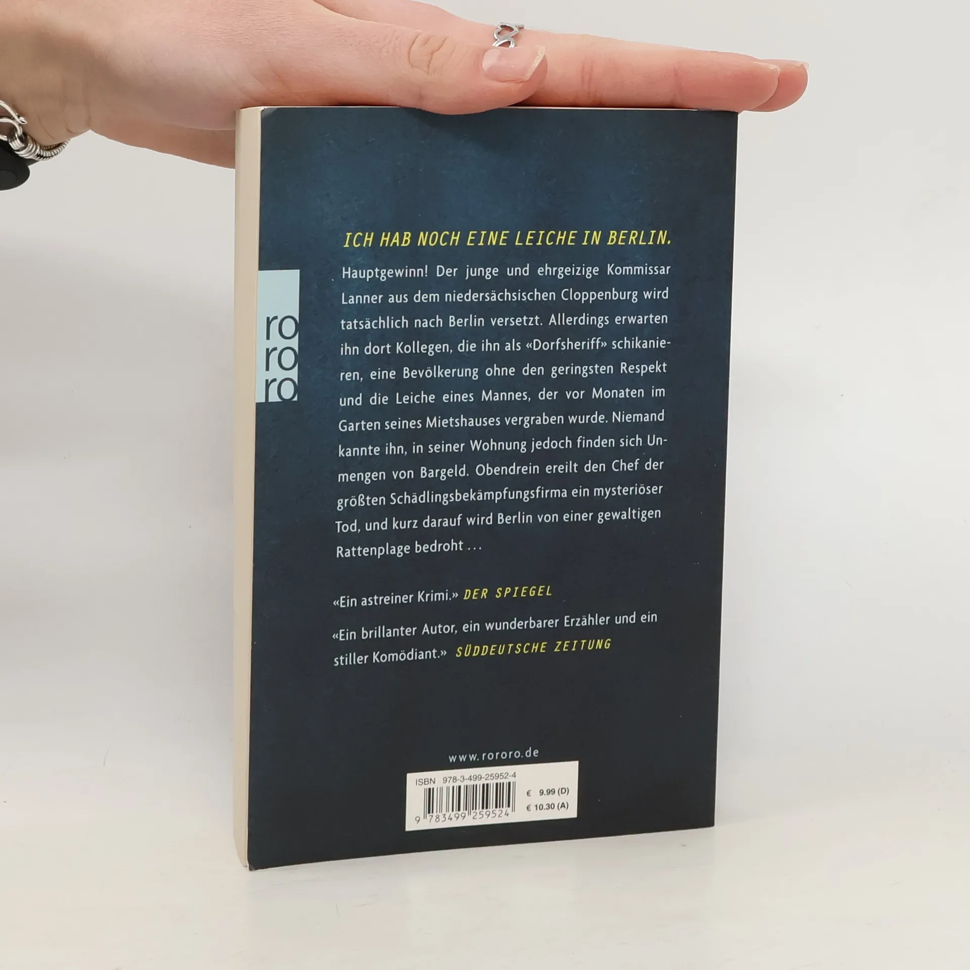 Ich hab noch eine Leiche in Berlin Hauptgewinn! Der junge und ehrgeizige Kommissar Lanner aus dem niedersächsischen Cloppenburg wird tatsächlich nach Berlin versetzt. Allerdings erwarten ihn dort Kollegen, die ihn als «Dorfsheriff» schikanieren, eine Bevölkerung ohne den geringsten Respekt und die Leiche eines Mannes, der vor Monaten im Garten seines Mietshauses vergraben wurde. Niemand kannte ihn, in seiner Wohnung jedoch finden sich Unmengen von Bargeld. Obendrein ereilt den Chef der größten Schädlingsbekämpfungsfirma ein mysteriöser Tod, und kurz darauf wird Berlin von einer gewaltigen Rattenplage bedroht …