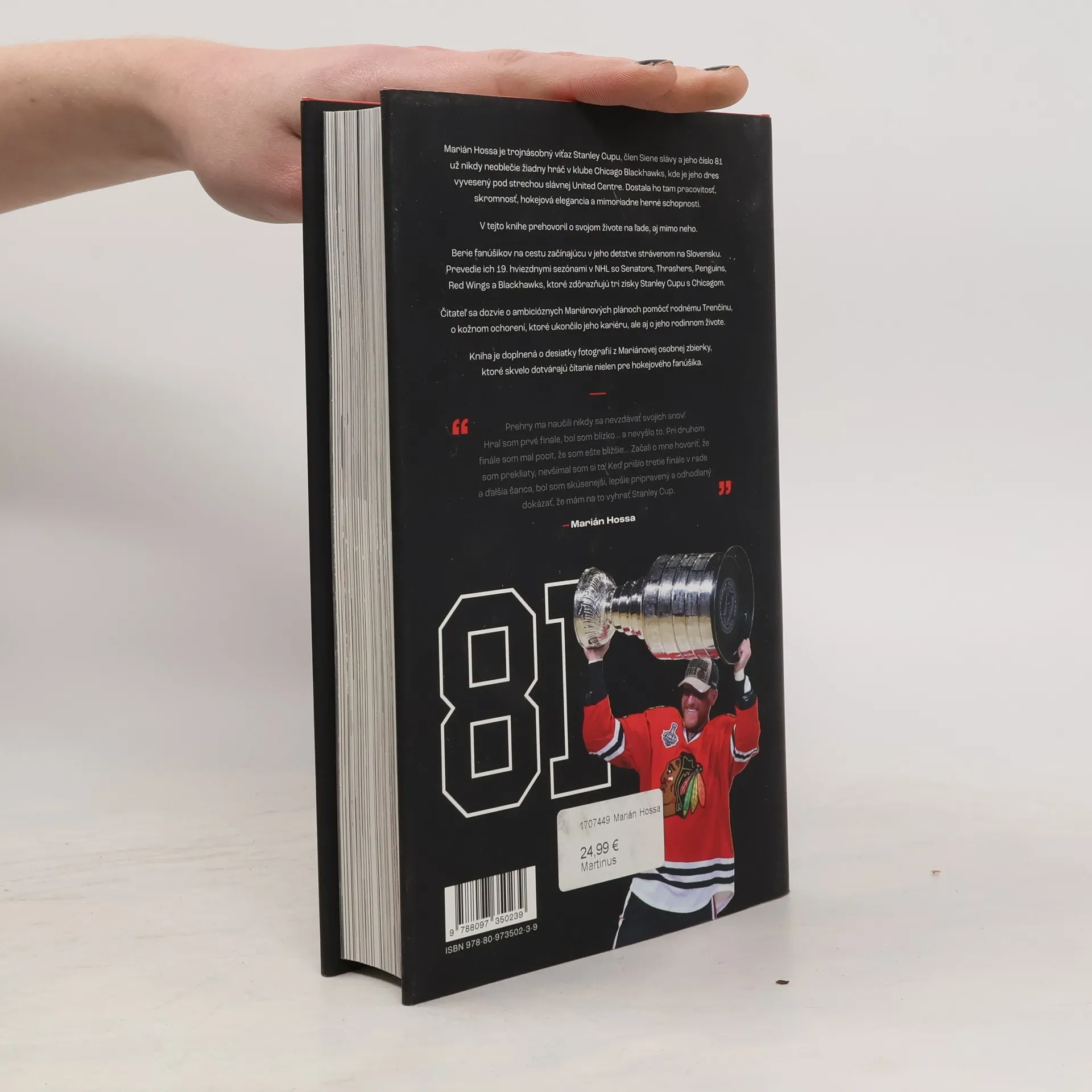 Prehry ma naučili, nikdy sa nevzdávať svojich snov!Hral som prvé finále, bol som blízko... a nevyšlo to. Pri druhom finále som mal pocit, že som ešte bližšie... Začali o mne hovoriť, že som prekliaty, nevšímal som si to! Keď prišlo tretie finále v rade a ďalšia šanca, bol som skúsenejší, lepšie pripravený a odhodlaný dokázať že mám na to vyhrať Stanley Cup. Marián Hossa je trojnásobný víťaz Stanley Cupu, člen Sieni Slávy a jeho číslo 81 už nikdy neoblečie žiadny hráč v klube Chicago Blackhawks, kde je jeho dres vyvesený pod strechou slávnej United Centre. Dostala ho tam pracovitosť, skromnosť, hokejová elegancia a mimoriadne herné schopnosti.Berie fanúšikov na cestu začínajúcu v jeho detstve strávenom na Slovensku. Prevedie ich 19. hviezdnymi sezónami v NHL so Senators, Thrashers, Pengiuns, Red Wings a Blackhawks, ktoré zdôrazňujú tri zisky Stanley Cupu s Chicagom.Čitateľ sa dozvie o ambicióznych Mariánových plánoch pomôcť rodnému Trenčínu, o kožnom ochorení, ktoré ukončilo jeho kariéru, ale aj o jeho rodinnom živote.Kniha je doplnená o desiatky fotografií z Mariánovej osobnej zbierky, ktoré skvelo dotvárajú čítanie nie len pre hokejového fanúšika.