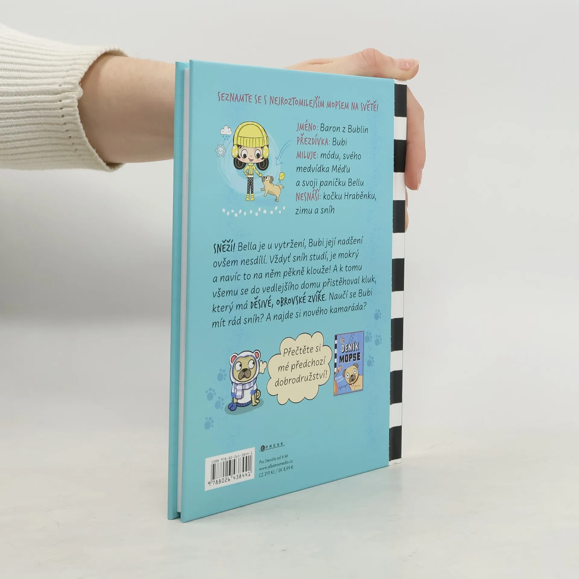 Sněží! Bella je u vytržení, Bubi její nadšení ovšem nesdílí. Vždyť sníh studí, je mokrý, a navíc to na něm pěkně klouže! A k tomu všemu se do vedlejšího domu přistěhoval kluk, který má děsivé, obrovské zvíře. Naučí se Bubi mít rád sníh? A najde si nového kamaráda?