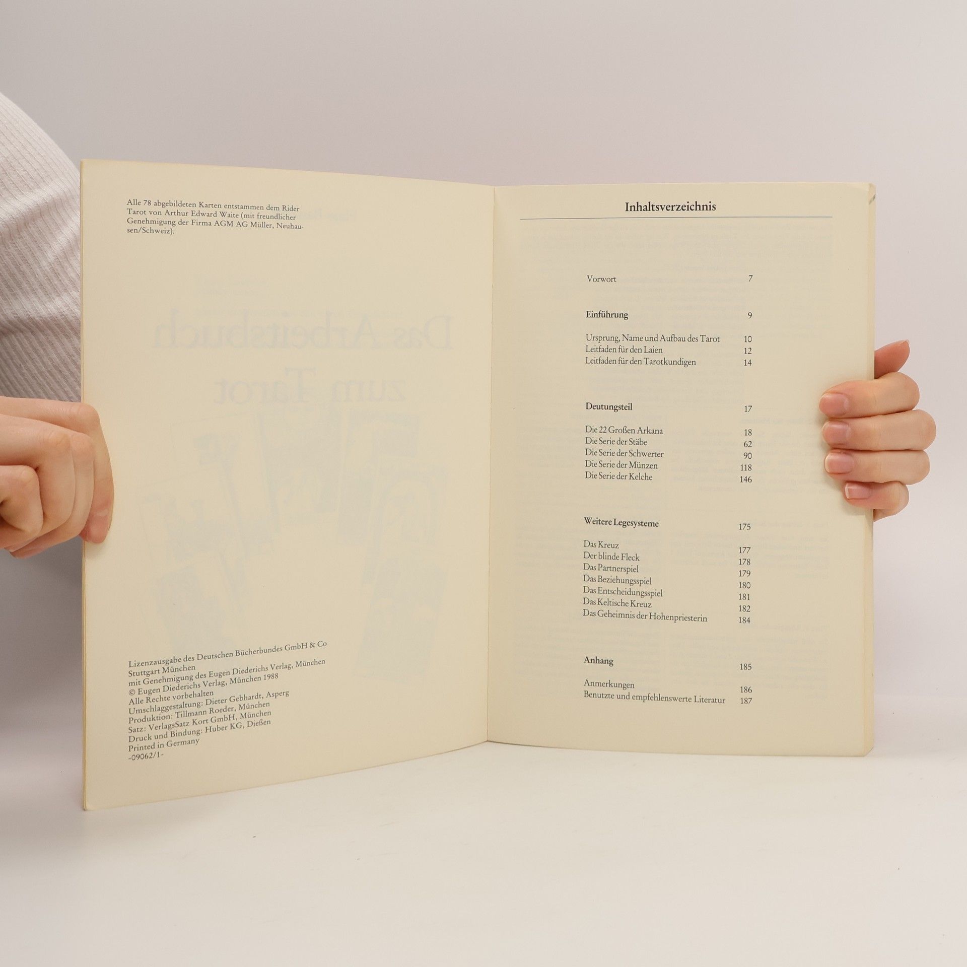 Das Arbeitsbuch zum Tarot läßt sich auf vielerlei Weise gebrauchen: • als Lehrbuch zum Tarot, das den praktischen Einstieg ohne theoretische Vorkenntnisse weist • als Orakelbuch, das bildverschlüsselte Antworten auf persönliche Fragen gibt • als Praxisbuch, das für alle 78 Tarotkarten die allgemeine Alltagsbedeutung und die speziellen Aussagen für die Bereiche Beruf, Beziehung und Bewußtsein erläutert • als Nachschlagebuch, das die unterschiedliche Bedeutung der 78 Karten für alle 7 Plätze des Spiels "Der Weg" erläutert • als Arbeitsbuch, das dem Leser genügend Raum für seine eigenen Erfahrungen läßt. Der Fragende wird nicht mit einer mehr oder minder zwangsläufigen Entwicklung konfrontiert. Ihm werden gangbare Wege aufgezeigt, ihm wird - anhand acht verschiedener Legesysteme - deutlich gemacht, wie er sich im Hinblick auf das Fragethema bislang verhalten hat, was er statt dessen tun soll und womit er dabei rechnen darf und muß. Für den Fortgeschrittenen sind vor allem die Alltagsbetrachtungen bereichernd, mit denen die 78 Karten in den verschiedenen Erfahrungsbereichen beschrieben werden. Darüber hinaus schaffen die jeweiligen mythologischen Bilder, die astrologischen Zuordnungen und I Ging-Entsprechungen einen größeren Gesichtskreis.