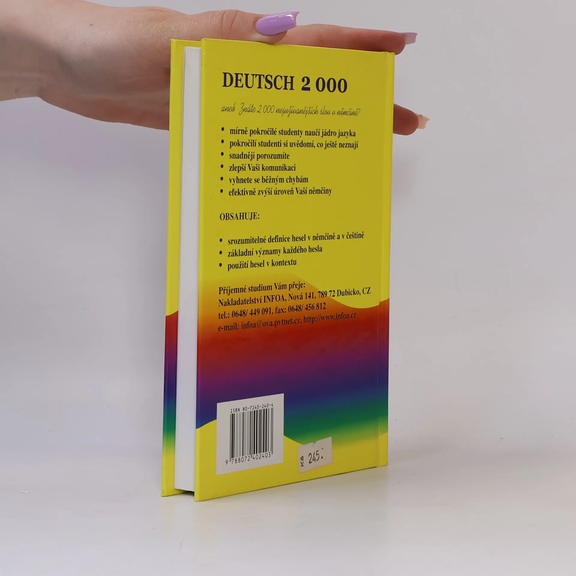aneb znáte 2000 nejpoužívanějších slov v němčině? Je určena pro mírně pokročilé studenty, naučí je jádro jazyka, pokročilí studenti si uvědomí, co ještě neznají, snadněji porozumí a zlepší si komunikaci, vyhnou se běžným chybám, efektivne zvýší úroveň němčiny. Kniha obsahuje srozumitelné definice hesel v němčine a v češtině, základní významy každého hesla, použití hesel v kontextu. První vydání.