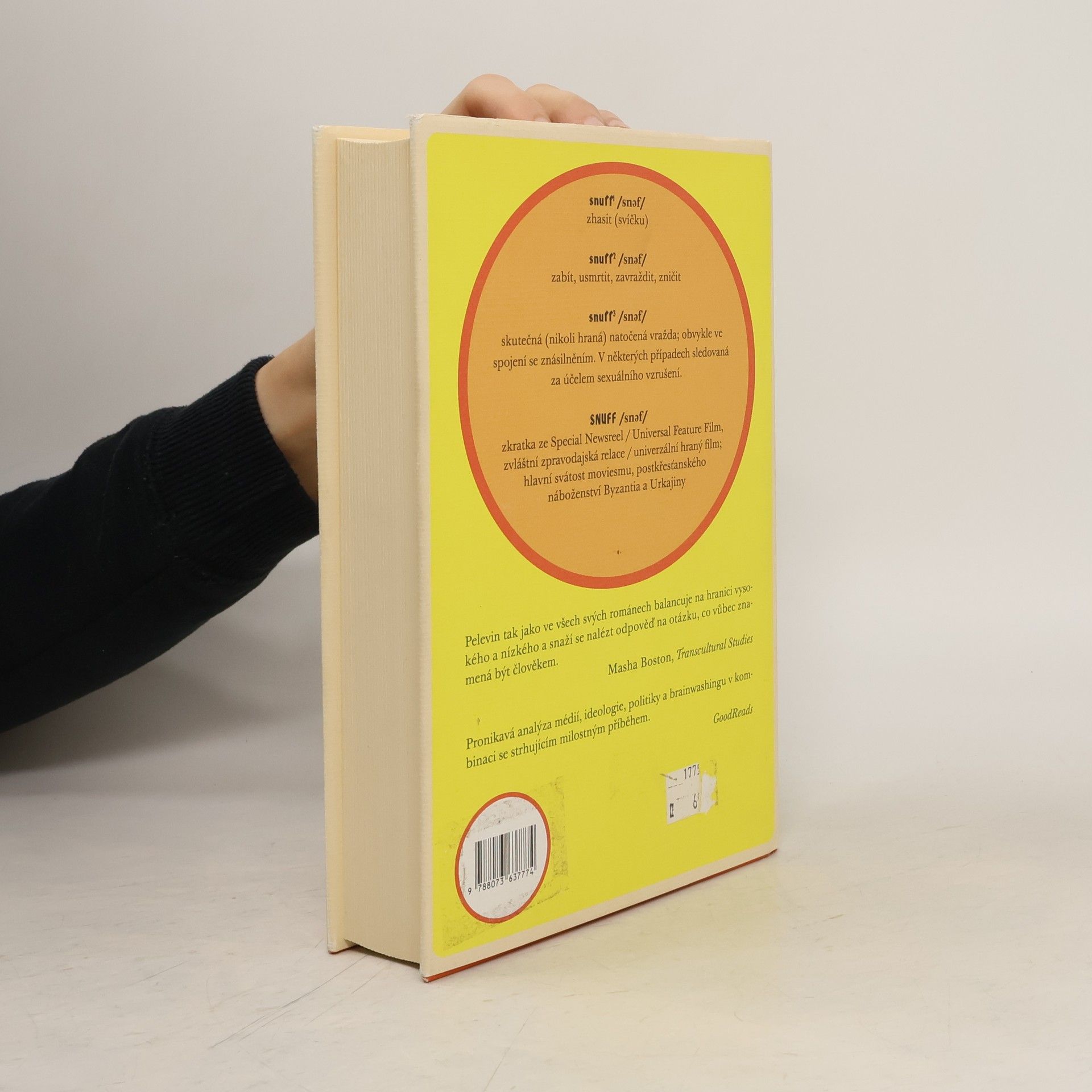 V groteskním postapokalyptickém románu SNUFF skloubil Viktor Pelevin jedinečnou společenskou satiru a trefnou karikaturu současného rozložení geopolitických sil. Damilola Karpov je bojový pilot-kameraman z Byzantia, gigantického bohatého města, které se vznáší nad zaostalou a barbarskou Urkajinou. Svými záběry se podílí na udržování neustálého válečného napětí a na utváření umělé reality. Vyprávěním o osudech dvou mladých urkajinských Orků a jedné byzantinské kybernetické ženy se špičkovou umělou inteligencí nám Damilola odhaluje mozaiku společenských manipulací, mechanismy mediálního zotročení a deformaci dekadentní doby, kdy pornografie a smrt diváka nudí a filmy přerostly v náboženský obřad. Román obsahuje mnoho narážek na dnešní sociální a politické poměry v Rusku i na Západě a na pozadí jejich vzájemné nevraživosti nám klade otázky o souvislostech mezi válkami a médii, o povaze zábavního průmyslu, ale i o vztahu lidství a technologie.