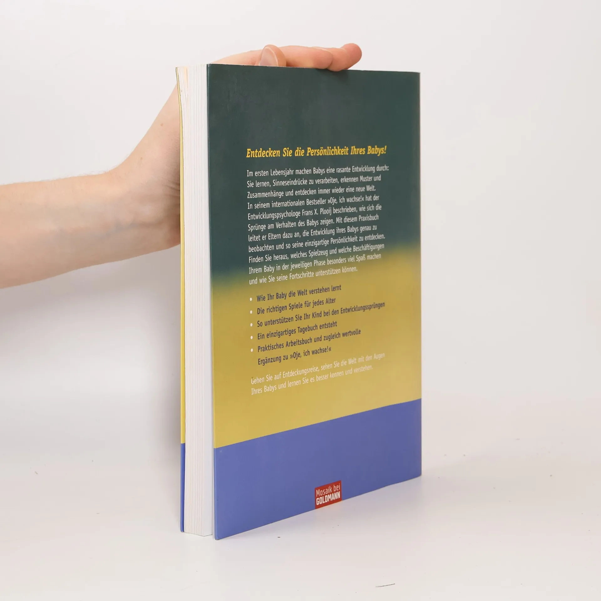 Kleinkinder besser verstehen und fördern Im ersten Lebensjahr machen Babys eine rasante Entwicklung durch. Sie lernen Sinneseindrücke zu verarbeiten, entdecken immer wieder eine neue Welt. In seinem internationalen Bestseller „Oje, ich wachse!“ hat der Verhaltensbiologe Frans X. Plooij beschrieben, wie sich diese Sprünge am Verhalten des Babys zeigen. Hier zeigt der Autor nun ganz konkret, wie Eltern ihrem Baby helfen können. Am schönsten und effektivsten funktioniert das spielerisch, denn in den verschiedenen Phasen sind die Kinder jeweils für ganz unterschiedliche Spielwelten empfänglich. Das Buch präsentiert Spiele mit Licht und Schatten, Bewegungsspiele, Spielzeug zum Tasten und Fühlen, Sprech- und Hörspiele und vieles mehr. Die richtigen Beschäftigungen zur richtigen Zeit helfen dem Baby, die Welt zu verstehen und die wichtigen Entwicklungssprünge gut zu meistern.
