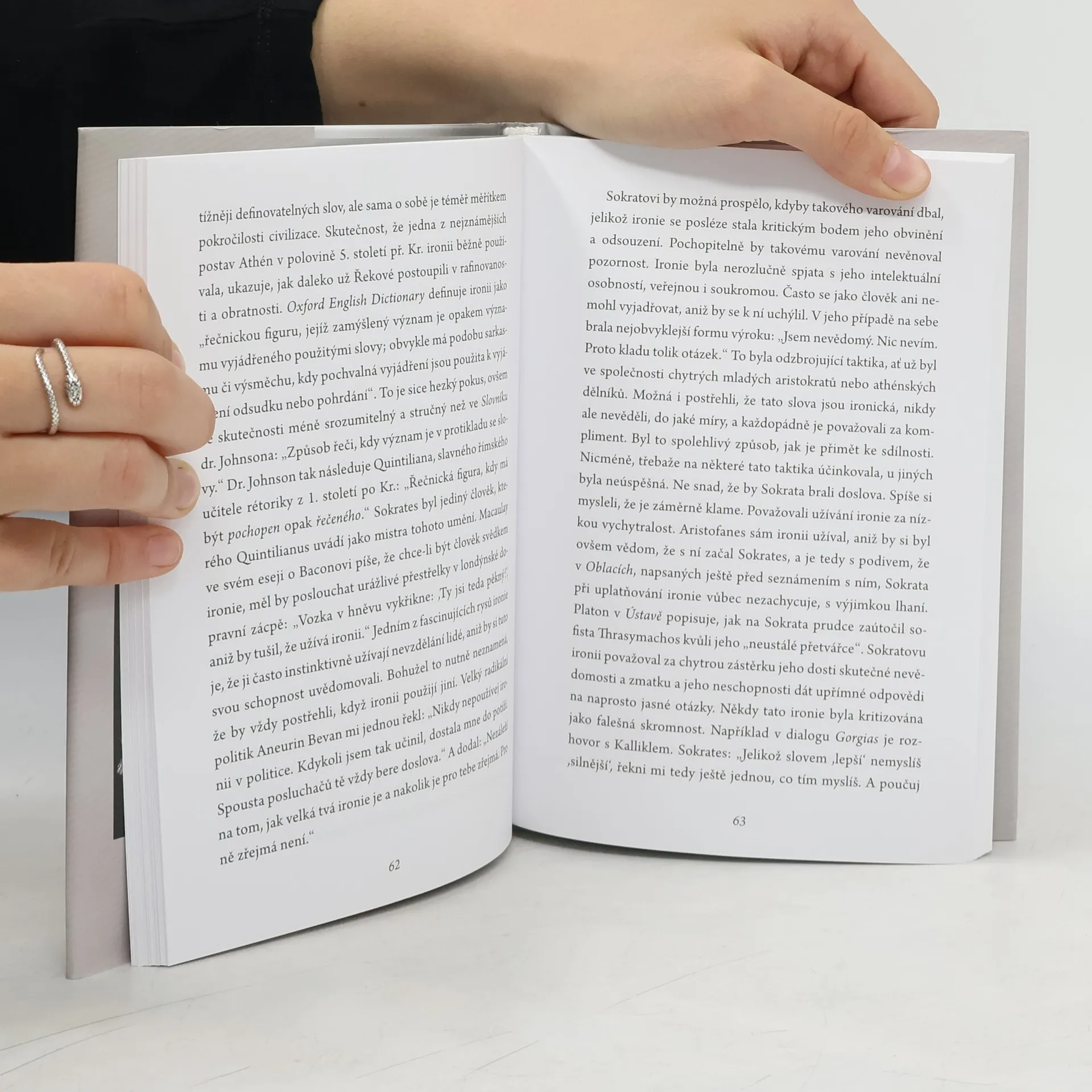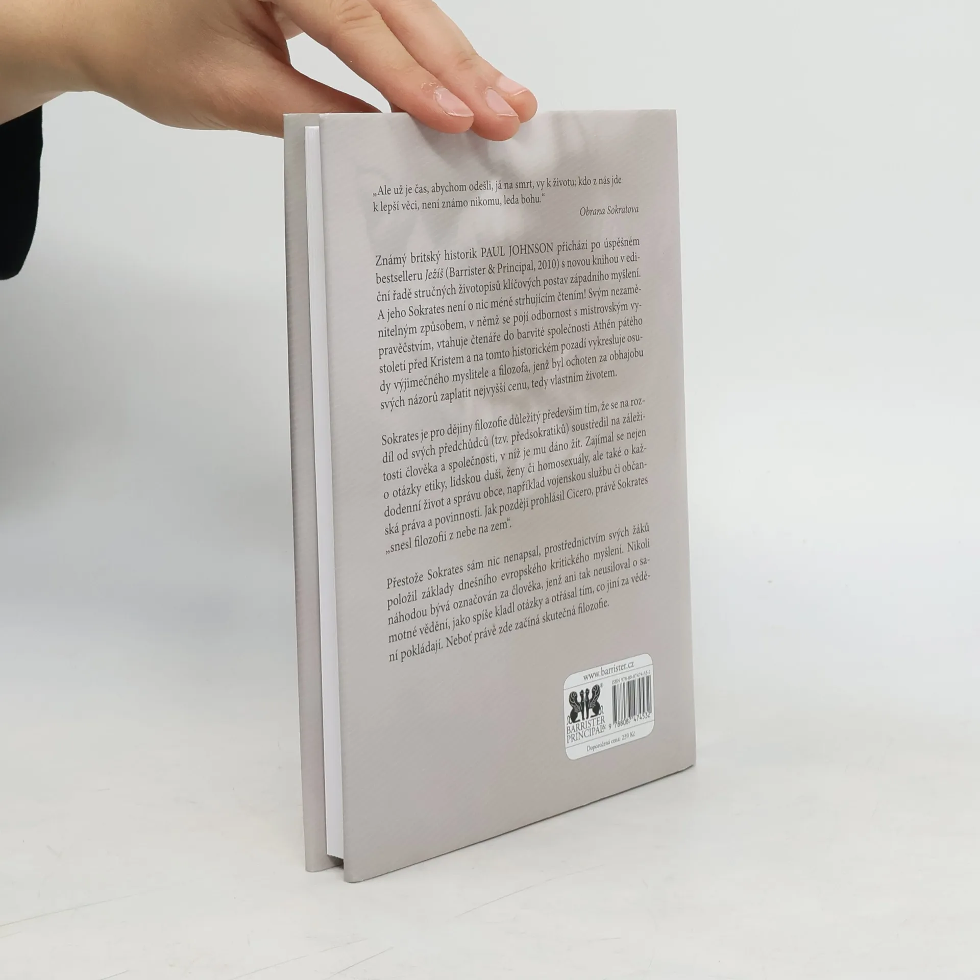 Proslulý americký historik Paul Johnson přichází po loňském Ježíši s knihou o Sokratovi, jednom z největších myslitelů všech dob, který však nic nenapsal. Po celý svůj život až do posledního dechu Sokrates plně ztělesňoval svou filozofii ve svých myšlenkách a činech. Příběh jeho života nám pomůže lépe pochopit hloubku jeho konání a myšlení. Paul Johnson svým nezaměnitelným způsobem, v němž se snoubí celoživotní odbornost s mistrovským vypravěčstvím, vtahuje čtenáře do poutavého líčení osudů tohoto charismatického muže ze střední třídy, žijícího v Athénách v 5. století před Kristem, a ukazuje, jak jeho myšlenky stále mají vliv na naše jednání i na naše pojetí těla a duše. Předkládá přesvědčivý obraz města a lidí, což obé bylo pro Sokrata neutuchajícím zdrojem zájmu a radosti, jakož i pronikavou analýzu konkrétních rysů jeho osobnosti. Výsledkem je příběh bohatého a pozoruhodného života člověka, který neudělal nic menšího, než že nám dal základní nástroje lidského myšlení.