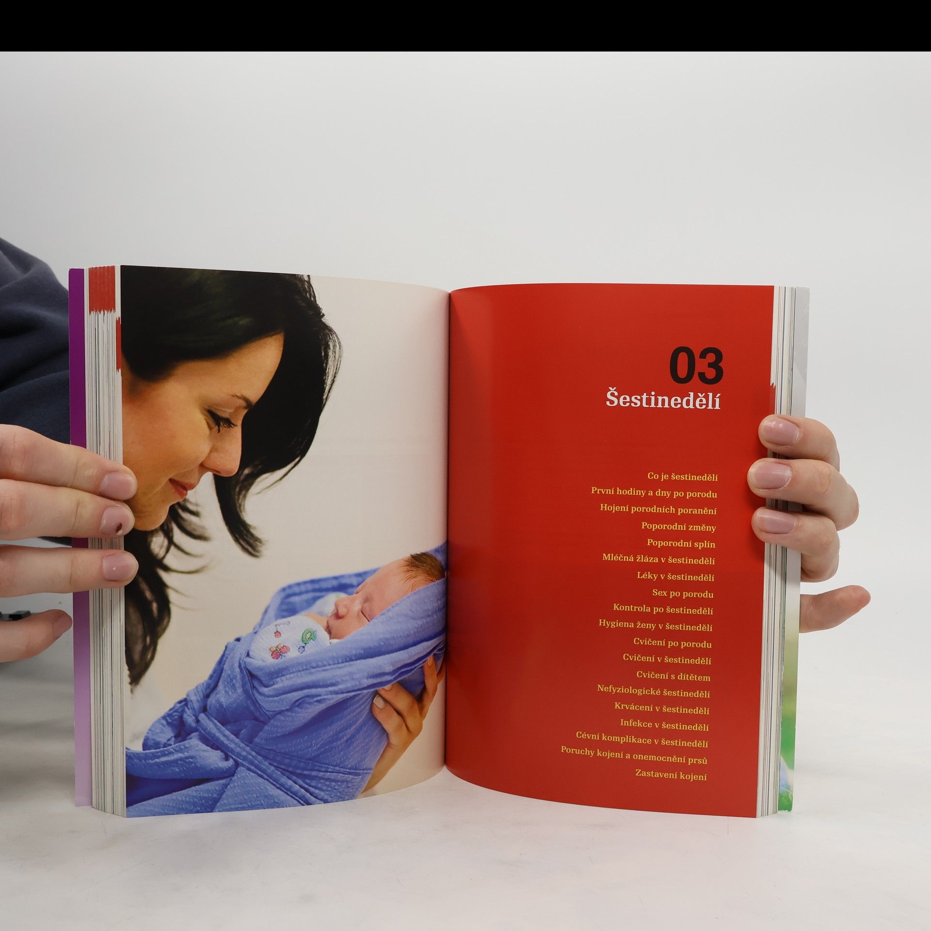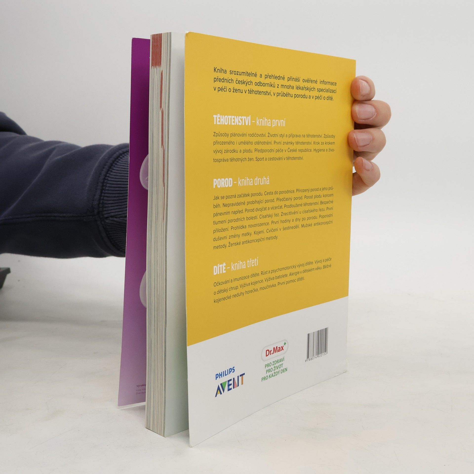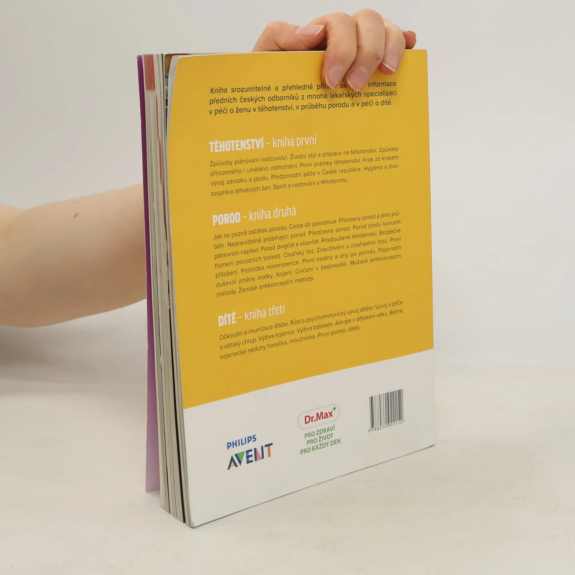 Kniha srozumitelně a přehledně přináší ověřené informace předních českých odborníků z mnoha lékařských oborů o těhotenství, porodu a péči o dítě. Jak se pozná začátek porodu. Cesta do porodnice. Porod přirozený. Průběh porodu. Nepravidelně probíhající porod. Předčasný porod. Porod plodu koncem pánevním napřed. Porod dvojčat a vícerčat. Prodloužené těhotenství. Bezpečné tlumení porodních bolestí. Císařský řez. Znecitlivění u císařského řezu. Prohlídka novorozence. První hodiny a dny po porodu. Poporodní duševní změny matky. Kojení. Cvičení v šestinedělí. Mužské antikoncepční metody. Ženské antikoncepční metody.