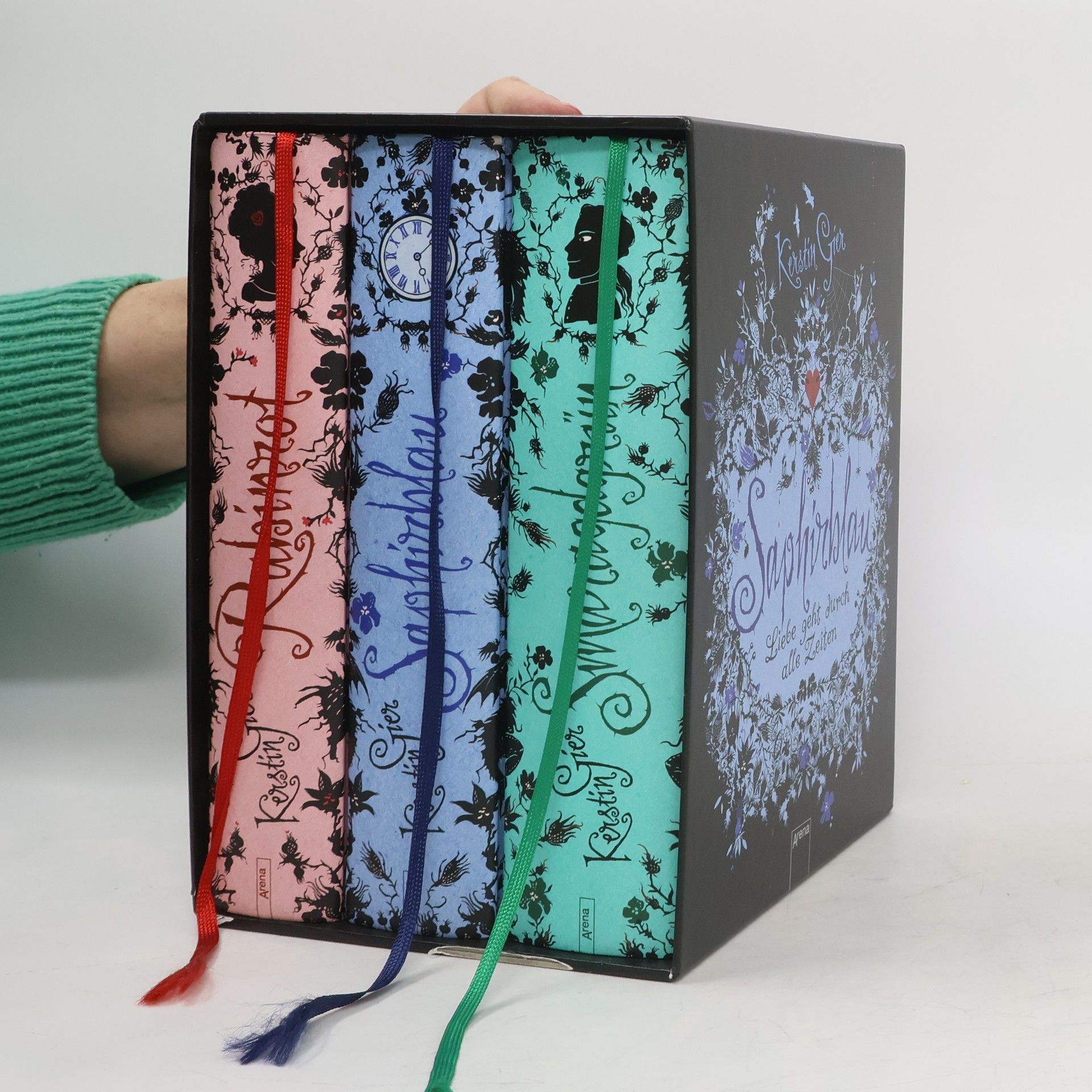 Rubinrot, Saphirblau, Smaragdgrün. Liebe geht durch alle Zeiten. Die Jubiläums-Sonderausgabe im Schuber. Ein MUSS für alle Fans von Bestseller-Autorin Kerstin Gier und ihrer Edelstein-Trilogie : Diese prachtvoll-opulente Schmuckausgabe gehört in jedes Bücherregal! Mit exklusiven Motiven zum Heraustrennen im Schuber - in limitierter Auflage. Der Schuber ist ein Highlight für alte und neue Fans der Zeitreisenden Gwendolyn und Gideon, deren Liebesgeschichte durch alle Zeiten geht. Inhalt: Manchmal ist es ein echtes Kreuz, in einer Familie zu leben, die jede Menge Geheimnisse hat. Der Überzeugung ist zumindest die 16- jährige Gwendolyn. Bis sie sich eines Tages aus heiterem Himmel im London um die letzte Jahrhundertwende wiederfindet. Ihr wird schnell klar, dass sie selbst das größte Geheimnis ihrer Familie ist, und dass man niemandem raten sollte, sich zwischen den Zeiten zu verlieben! Die hochwertig veredelte, streng limitierte Schmuckausgabe umfasst die drei Einzelbände „Rubinrot“, „Saphirblau“ und „Smaragdgrün“ - mehr als 1.200 Seiten Zeitreise-Romantik pur! Großartig illustriert von Eva Schöffmann-Davidov.