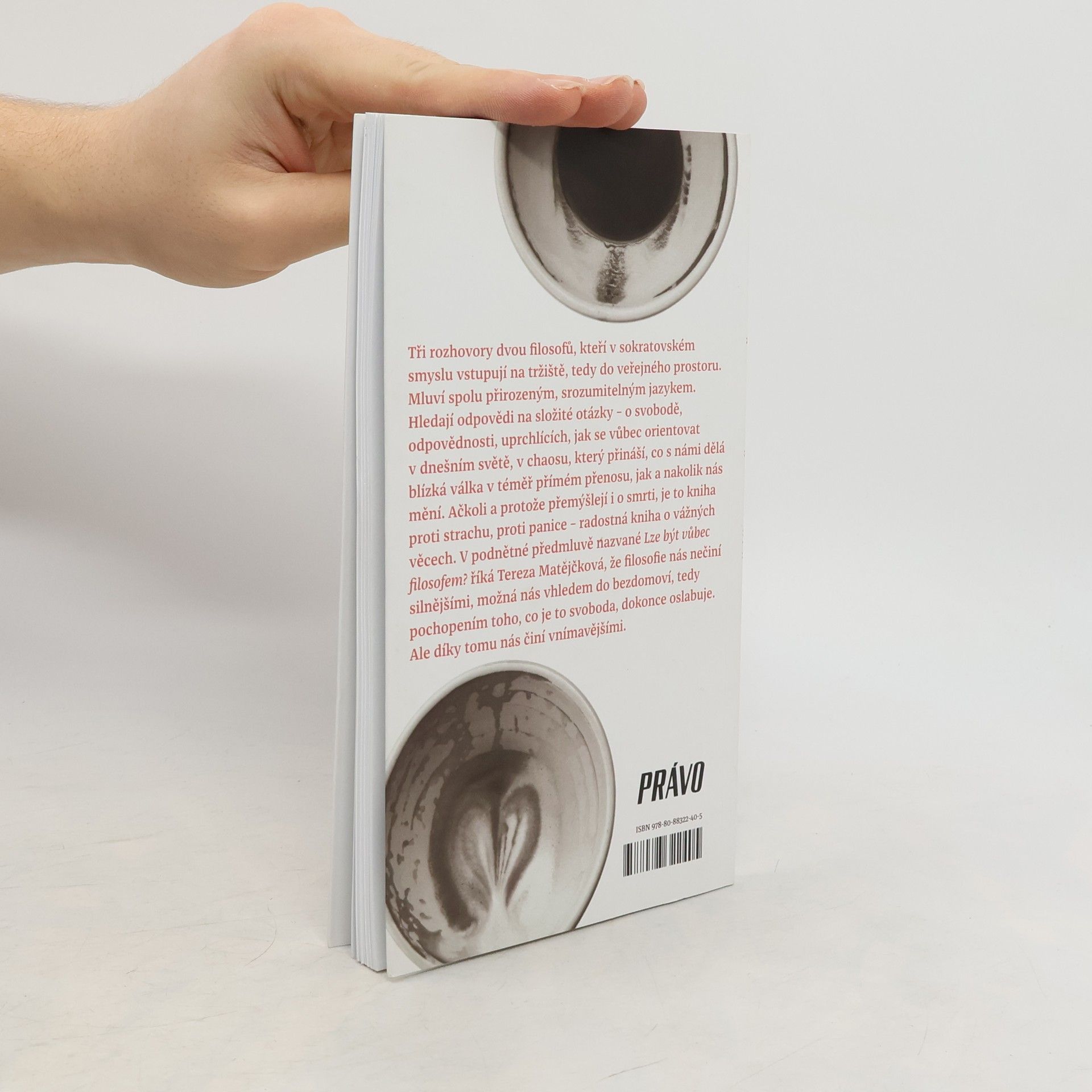 Tři rozhovory dvou filosofů, kteří v sokratovském smyslu vstupují na tržiště, tedy do veřejného prostoru. Mluví spolu přirozeným, srozumitelným jazykem. Hledají odpovědi na složité otázky – o svobodě, odpovědnosti, uprchlících, jak se vůbec orientovat v dnešním světě, v chaosu, který přináší, co s námi dělá blízká válka v téměř přímém přenosu, jak a nakolik nás mění. Ačkoli a protože přemýšlejí i o smrti, je to kniha proti strachu, proti panice – radostná kniha o vážných věcech. V podnětné předmluvě nazvané Lze být vůbec filosofem? říká Tereza Matějčková, že filosofie nás nečiní silnějšími, možná nás vhledem do bezdomoví, tedy pochopením toho, co je to svoboda, dokonce oslabuje. Ale díky tomu nás činí vnímavějšími.