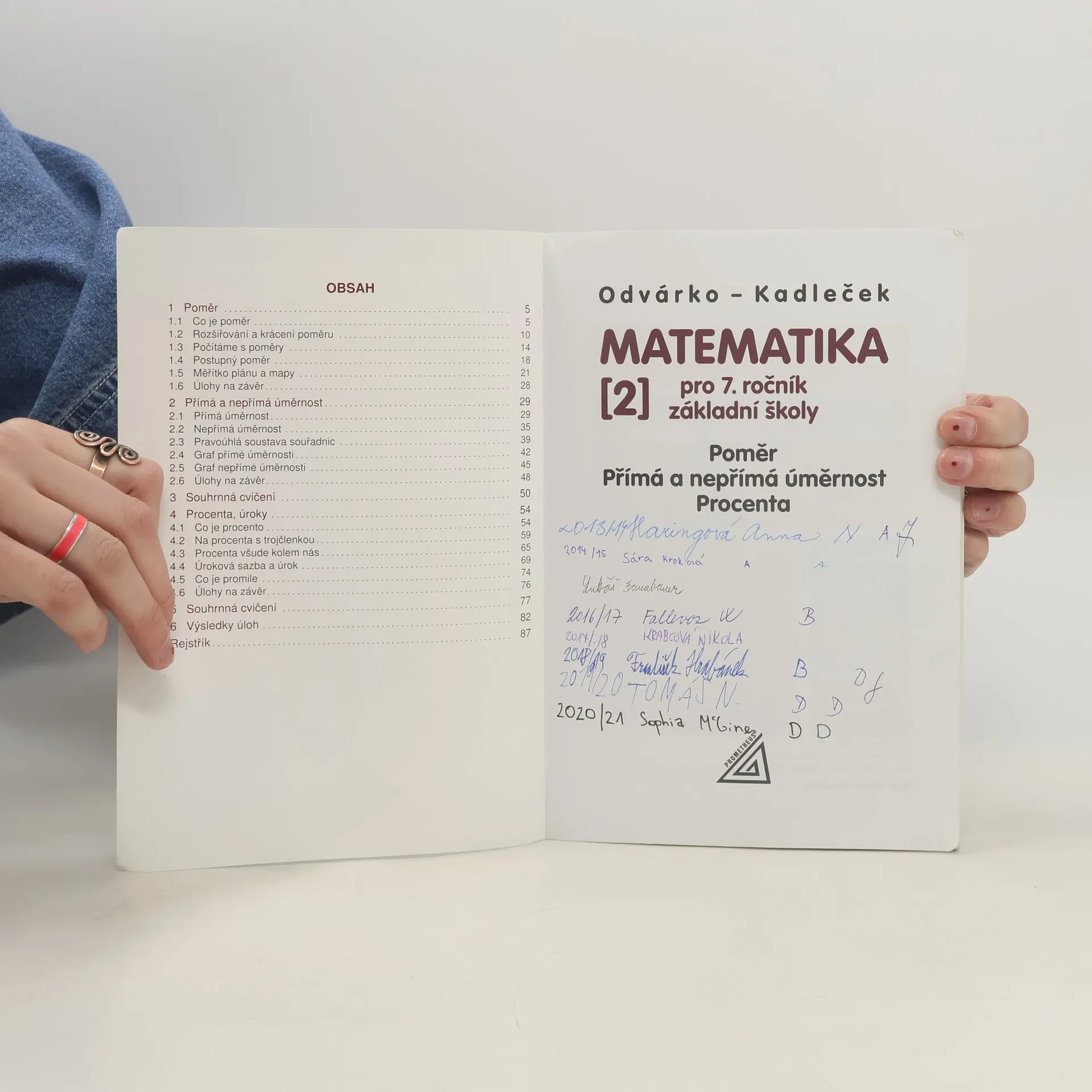 Učebnice je součástí přepracované řady učebnic matematiky. Upravené vydání ještě lépe odpovídá RVP, obsahuje aktuálnější údaje a je pro žáky atraktivnější i vzhledem k nové grafické úpravě. Upravená učebnice zachovává koncepci původní řady, seznamuje s tím, co je poměr (tvoření kuchařských receptů), přímá a nepřímá úměrnost (trojčlenka) a procenta (úrokové sazby vkladů a úvěrů). Úlohy ve Cvičeních jsou aktualizovány (měna při placení nákupů, výše cen). Je zařazena i řada nových úloh ukazujících důležitost matematických poznatků pro život a podněcujících žáky k plnění různých úkolů a vyhledávání informací. Jsou posíleny nestandardní aplikační úlohy a problémy (např. rozvoj geometrické představivosti, kombinatorické úlohy). Mnohé úlohy vedou k zamyšlení nad problémy, které souvisejí s životním prostředím (např. úsporné žárovky, kouření). Nejvíce změn je v grafickém vybavení.Učebnice je barevná, jsou v ní zařazeny fotografie reálných objektů a situací, vtipné a motivující barevné ilustrace. Přepracované vydání učebnice je na obálce graficky vyznačeno žlutým lomeným proužkem v levém dolním rohu obrázku. Učebnice má schvalovací doložku MŠMT. Tato učebnice je zpracována podle Rámcového vzdělávacího programu pro základní vzdělávání. OBSAH: 1 Poměr 2 Přímá a nepřímá úměrnost 3 Souhrnná cvičení 4 Procenta. Úroky 5 Souhrnná cvičení 6 Výsledky úloh Rejstřík