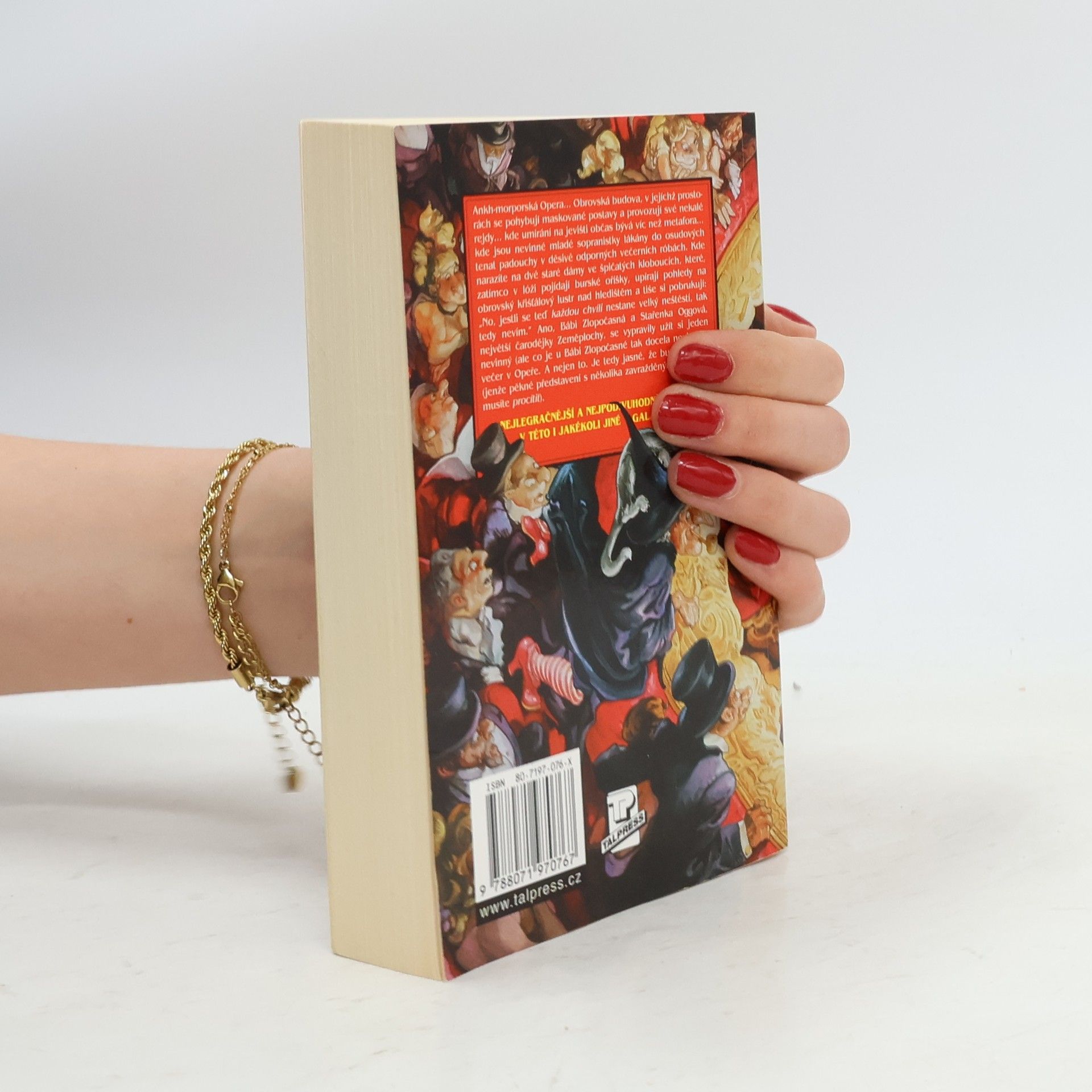 Anhk-morporkská Opera... obrovská budova, v jejíchž prostorách se pohybují maskované postavy a provozují své nekalé rejdy... kde umírání na jevišti občas bývá víc než metafora ... kde jsou nevinné mladé sopranistky lákány do osudových tenat padouchy v děsivě odporných večerních robách. Kde narazíte na dvě staré dámy ve špičatých kloboucích, které zatímco v lóži pojídají burské oříšky, upírají pohledy na obrovský křišťálový lustr nad hledištěm a tiše si pobrukují: "No, jestli se teď každou chvíli nestane velký neštěstí, tak teda nevím." Ano, Bábi Zlopočasná a Stařenka Oggová, největší čarodějky Zeměplochy, se vypravily užít si jeden nevinný (ale co je u Bábi Zlopočasné tak docela nevinné?) večer v Opeře. A nejen to. Je tedy jasné, že budou potíže (jenže pěkné představení s několika zavražděnými si prostě musíte procítit). Úžasná Zeměplocha, kniha 18., přeložil Jan Kantůrek.