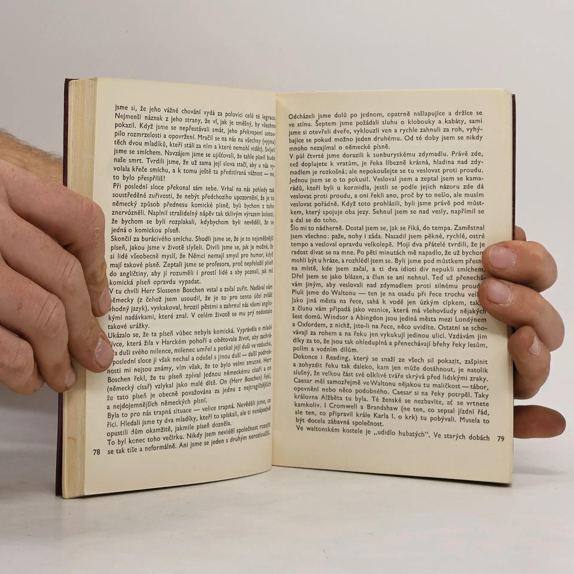 Rozmarný příběh tří přátel, kteří se vypraví společně na několikadenní dovolenou po řece Temži, patří ke klasickým dílům světové humoristické literatury. Vyprávění je pestrou směsicí příhod a událostí, které je po dobu této svérázné výpravy potkávají na palubě jejich člunu i v pobřežních hospůdkách. Autor používá klidný, suchý humor, s jehož pomocí odhaluje lidské slabosti, návyky a zlozvyky a velebí přátelskou solidaritou a touhou po dobrodružství. Ilustroval Vratislav Hlavatý. 2. vydání.